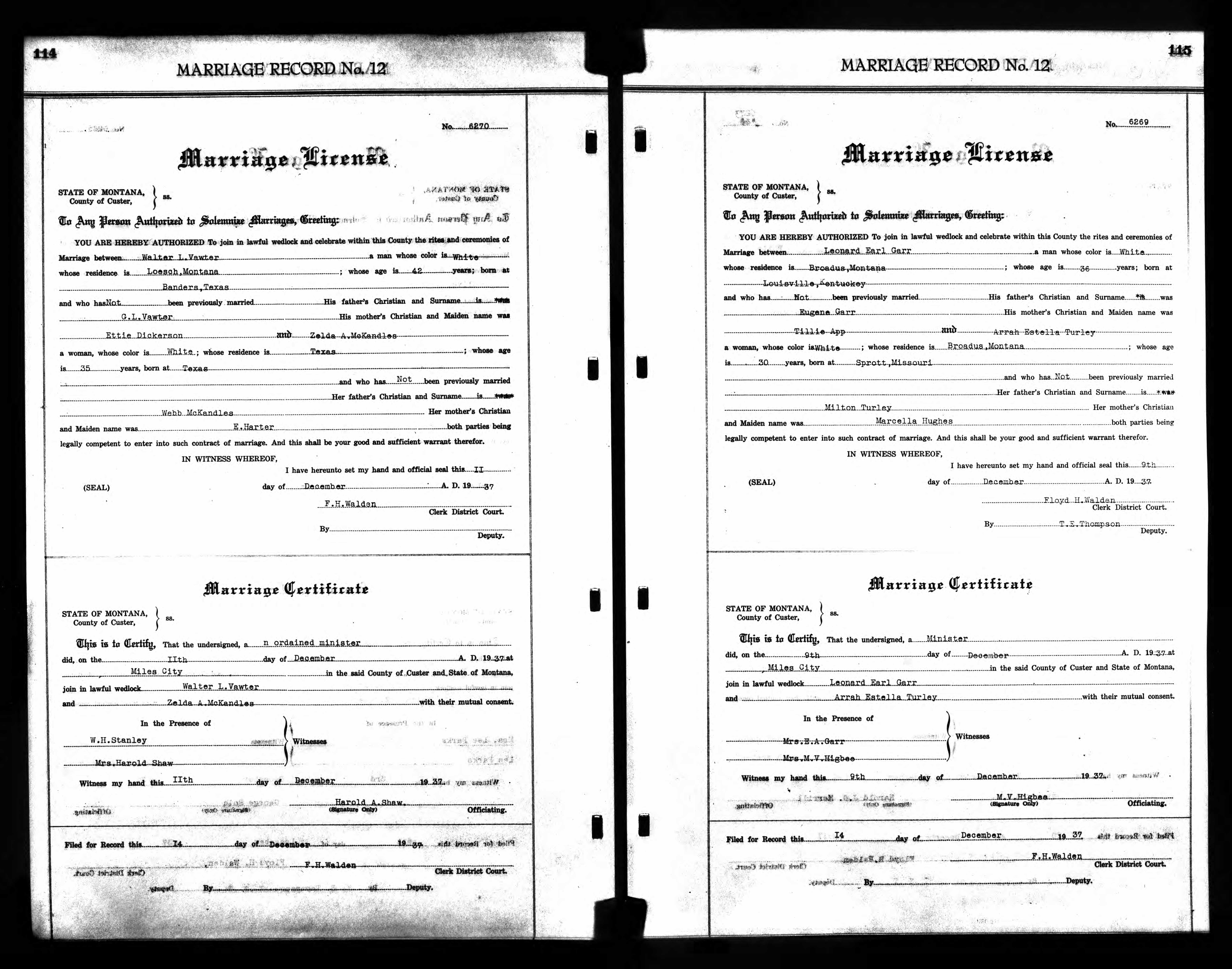 Montana Marriage Record, Leonard Earl Garr and Arrah Estella Turley