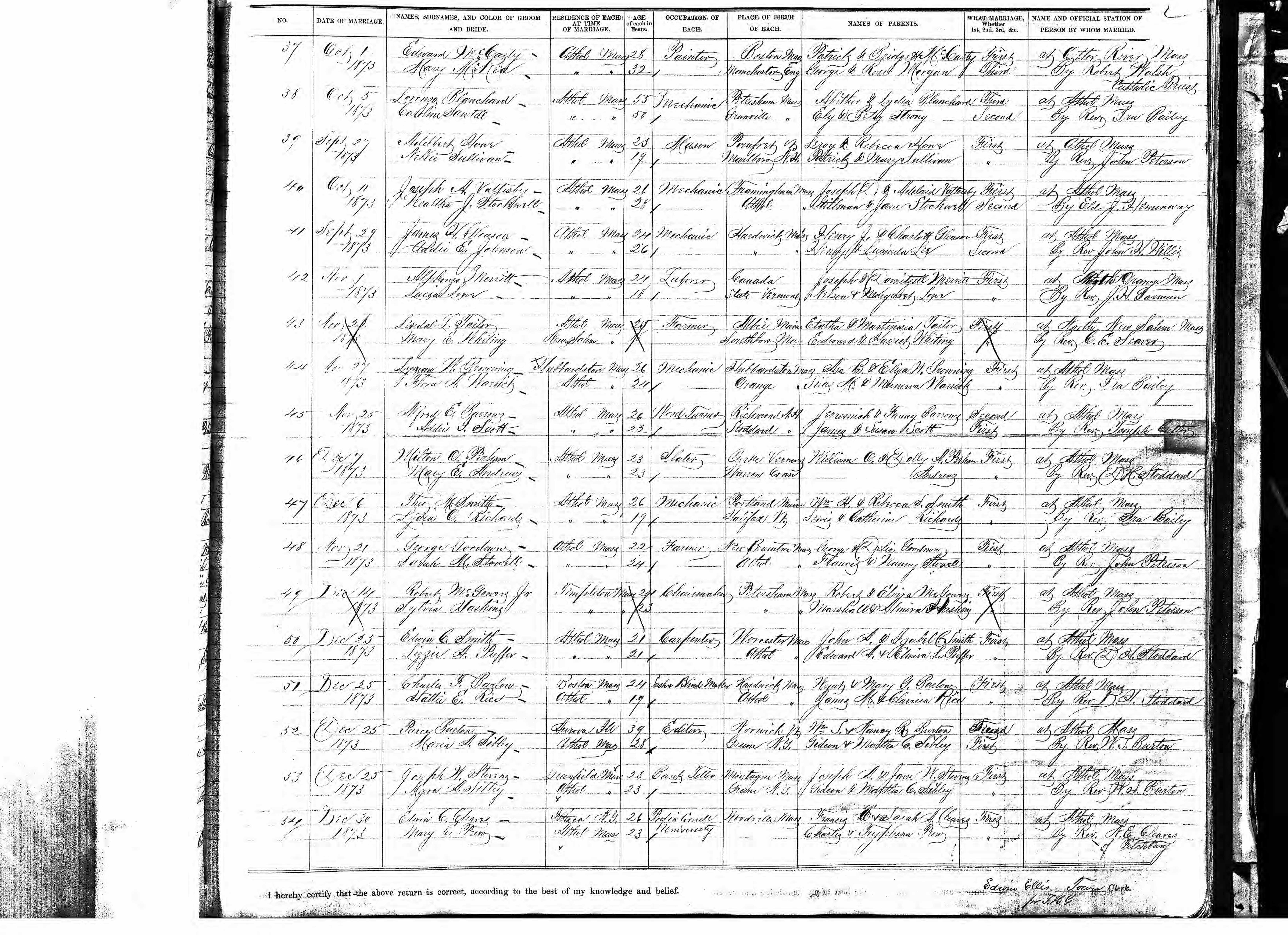 Massachusetts Marriage Record, Lorenzo Blanchard and Caroline Sawtell