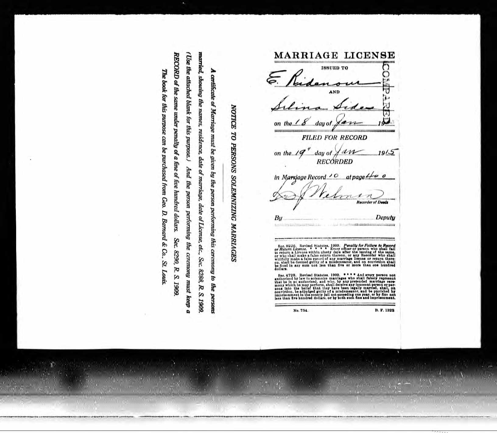 Missouri Marriage Record, E. Ridenour and Selina Sides