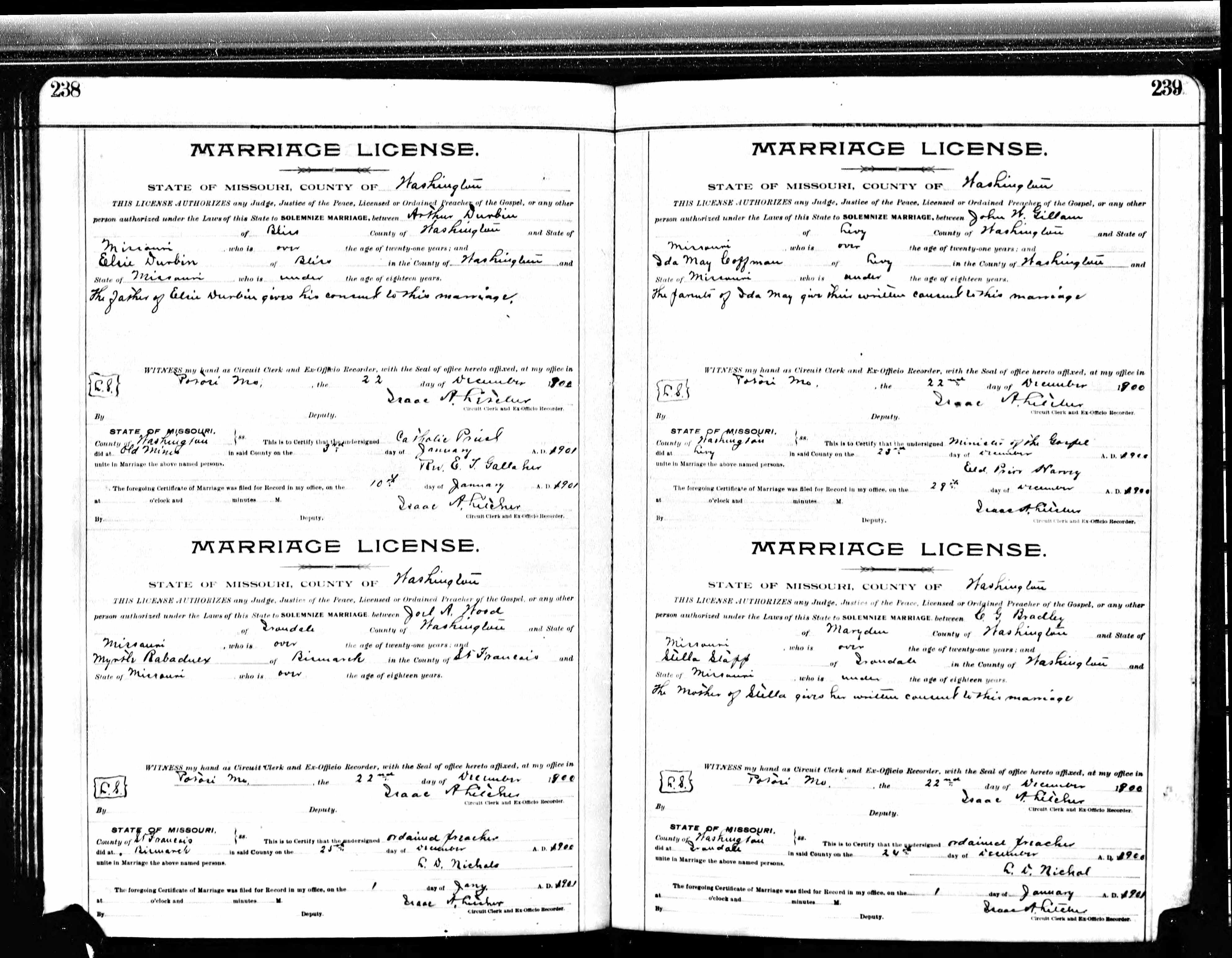 Missouri Marriage Record, John W. Gillam and Ida May Coffman