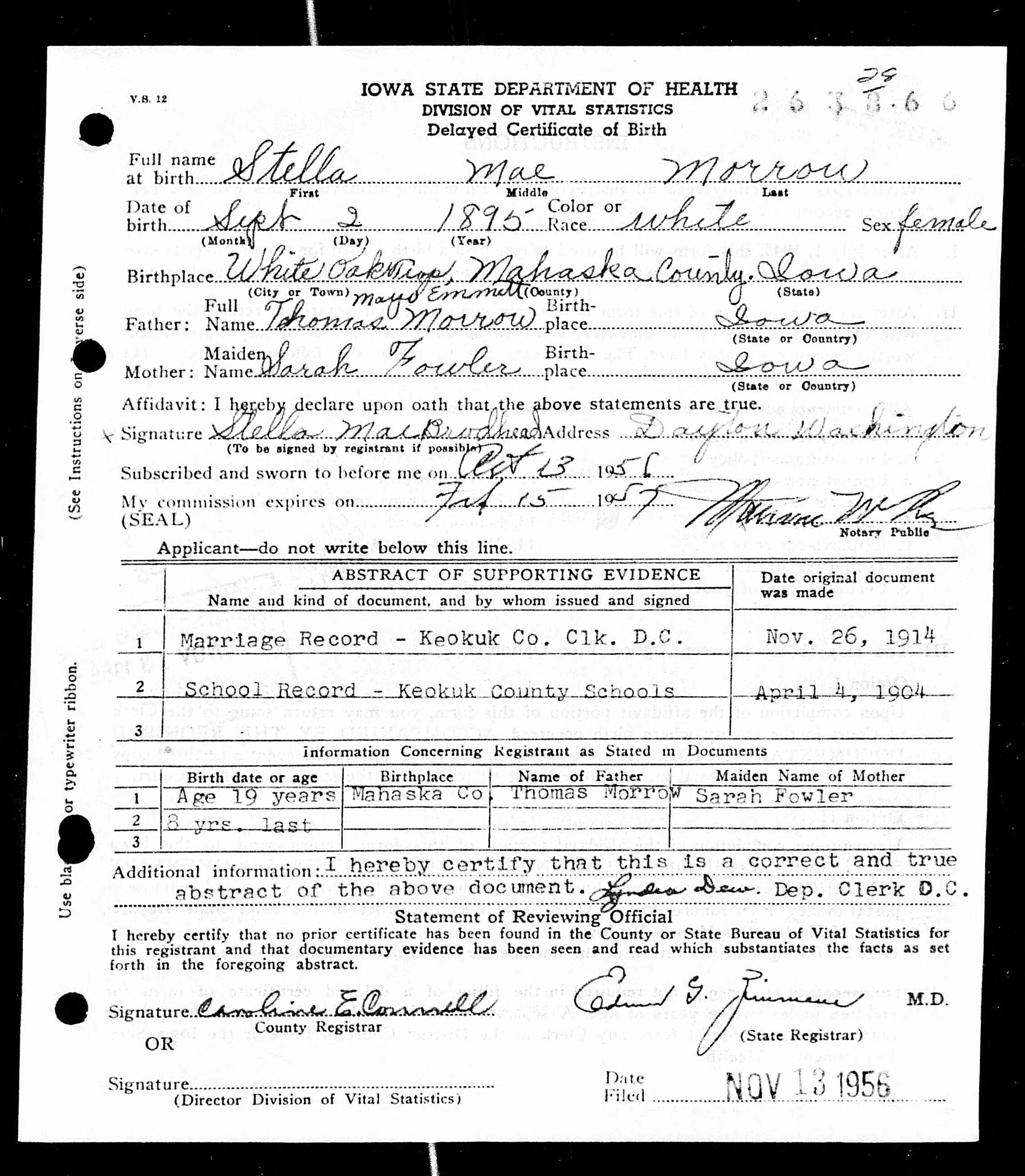 Delayed Birth Certificate, Stella Mae Morrow