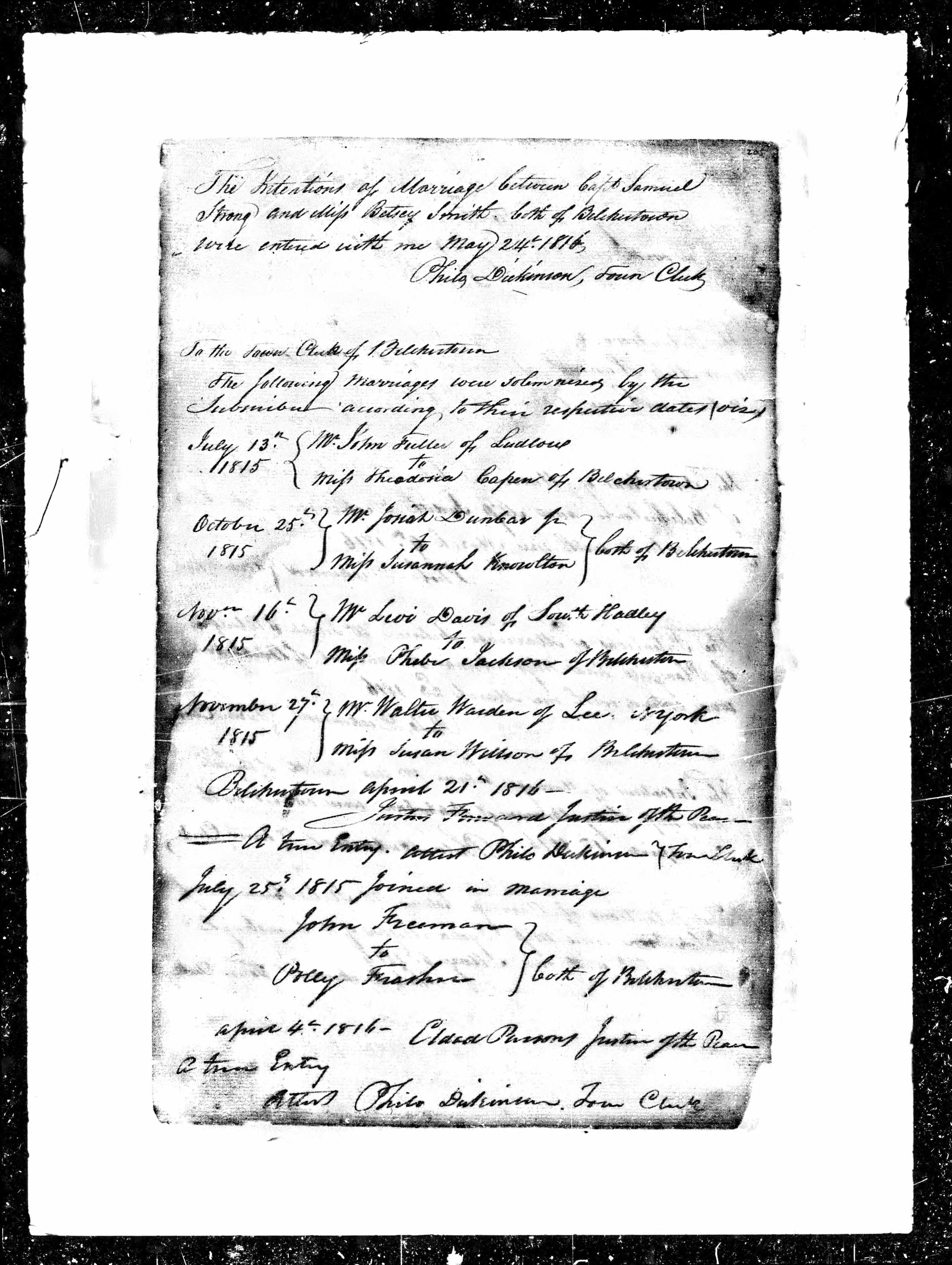 Massachusetts Town and Vital Records, Captain Samuel Strong and Betsey Smith Marriage Intentions