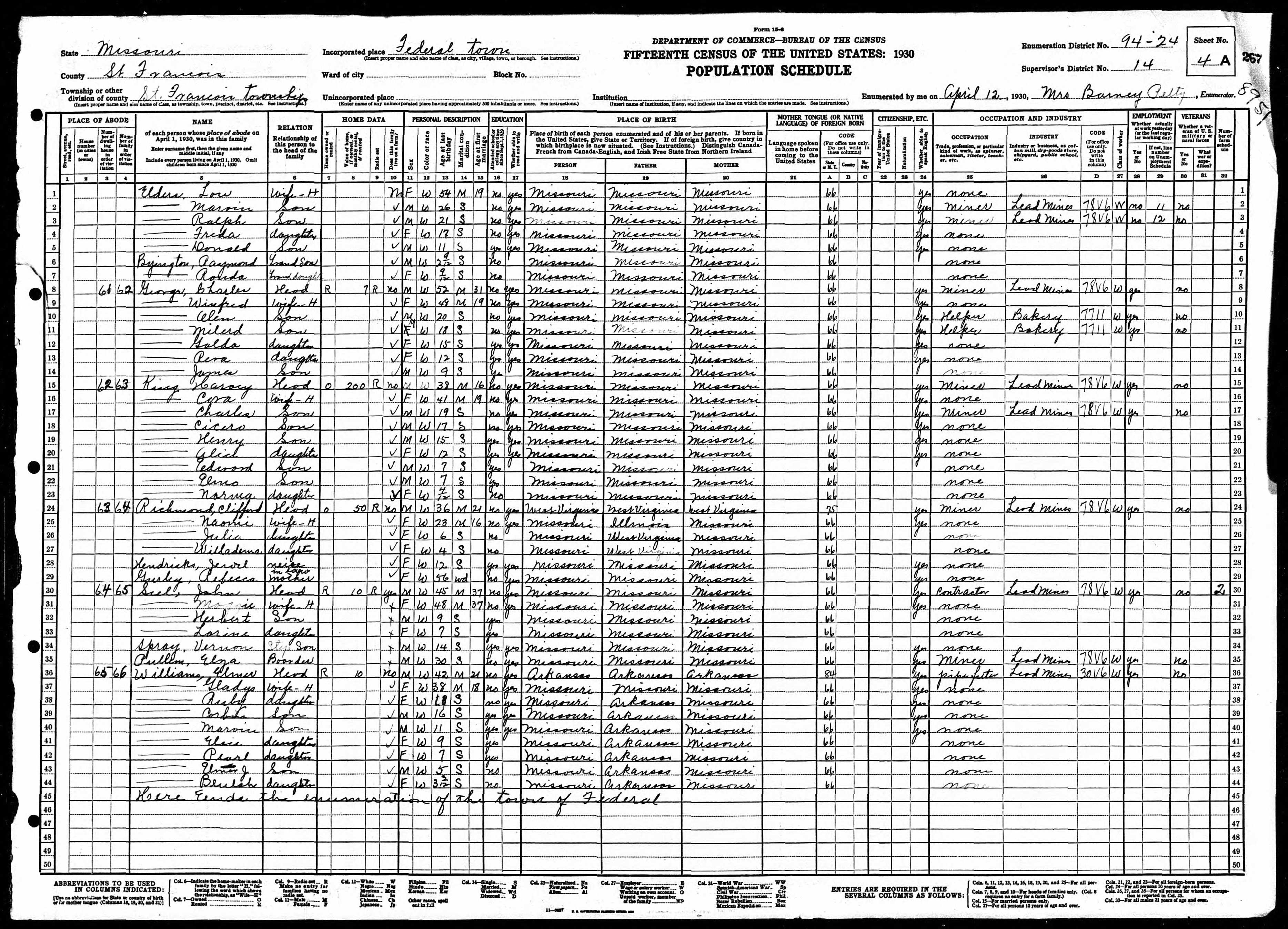 1930 Census, Federal, St. Francois county, Missouri
