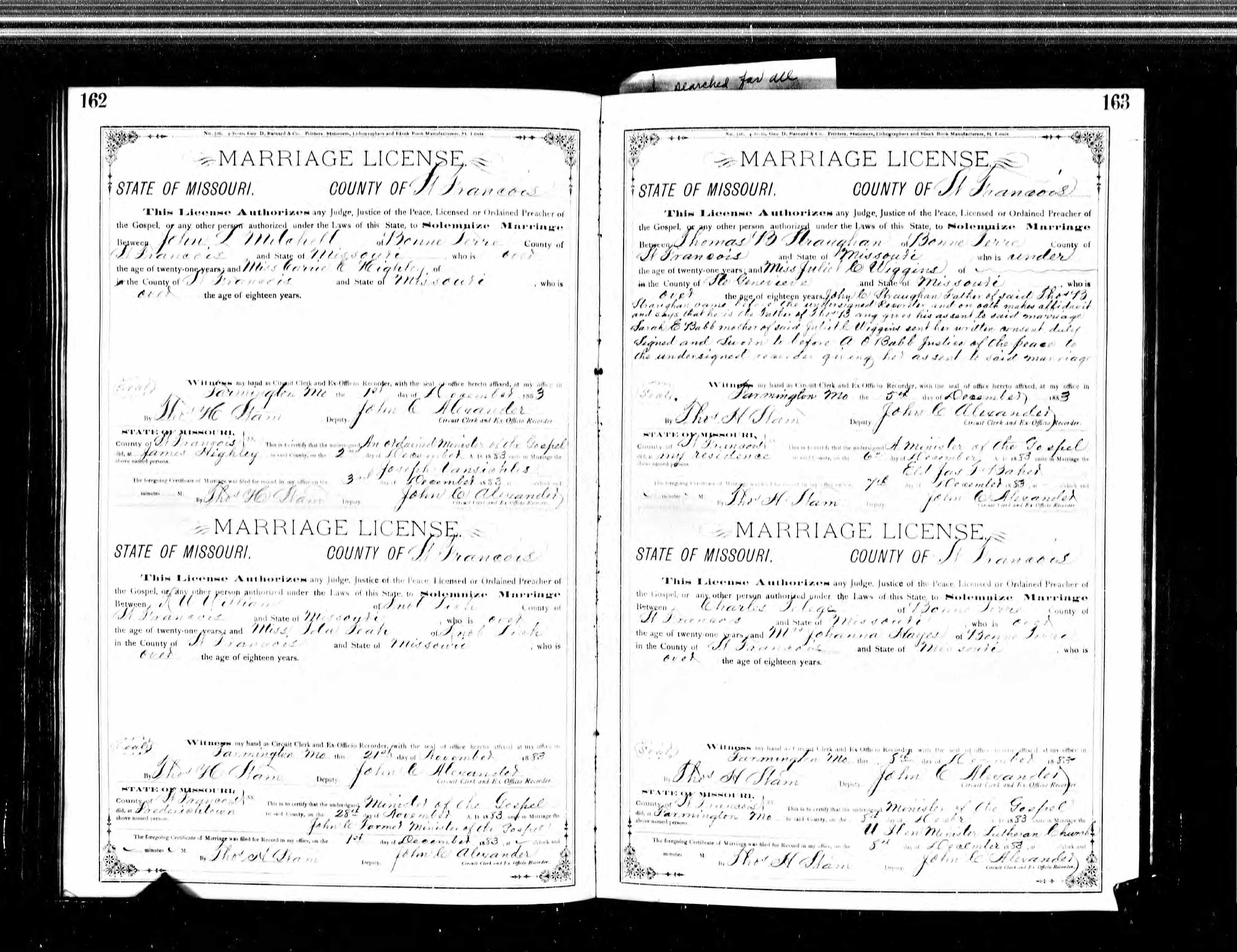 Missouri Marriage Record, Thomas B. Straughan and Juliet C. Wiggins