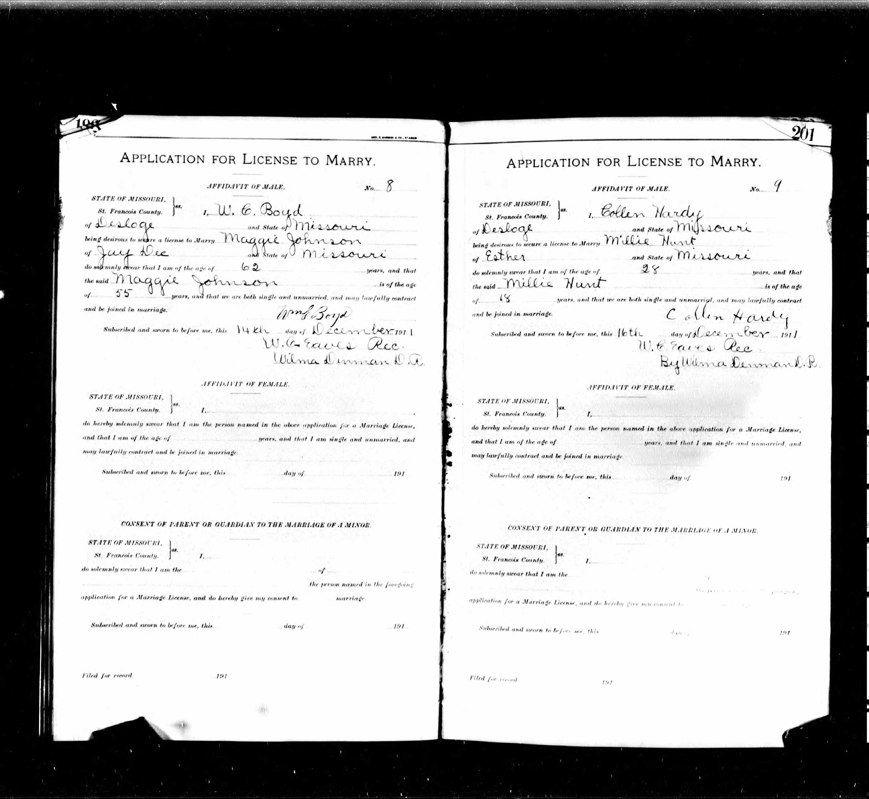 Missouri Marriage Application, W. C. Boyd and Maggie Johnson