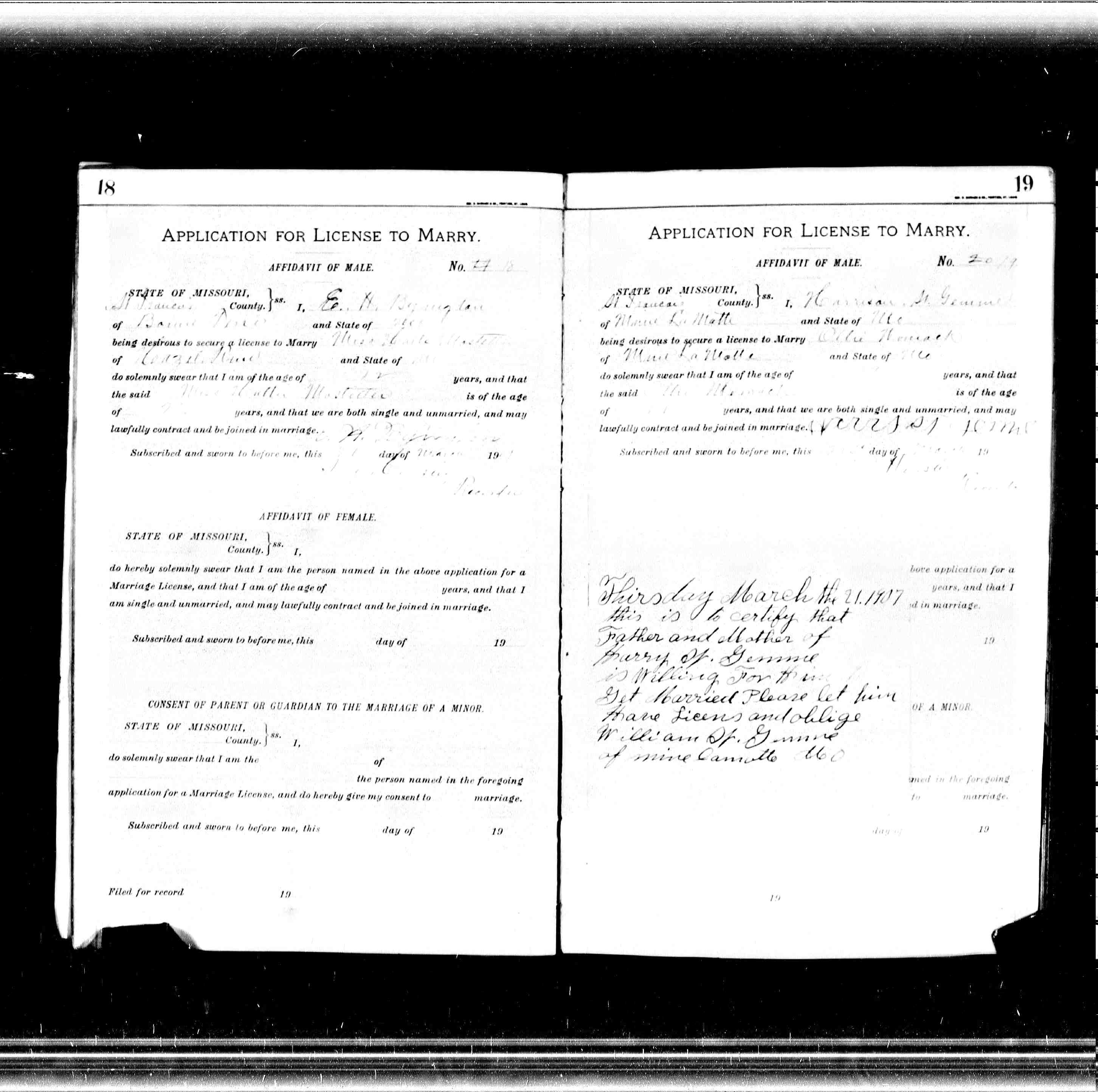 Missouri Marriage Application, E. H. Byington and Hattie Mostiller