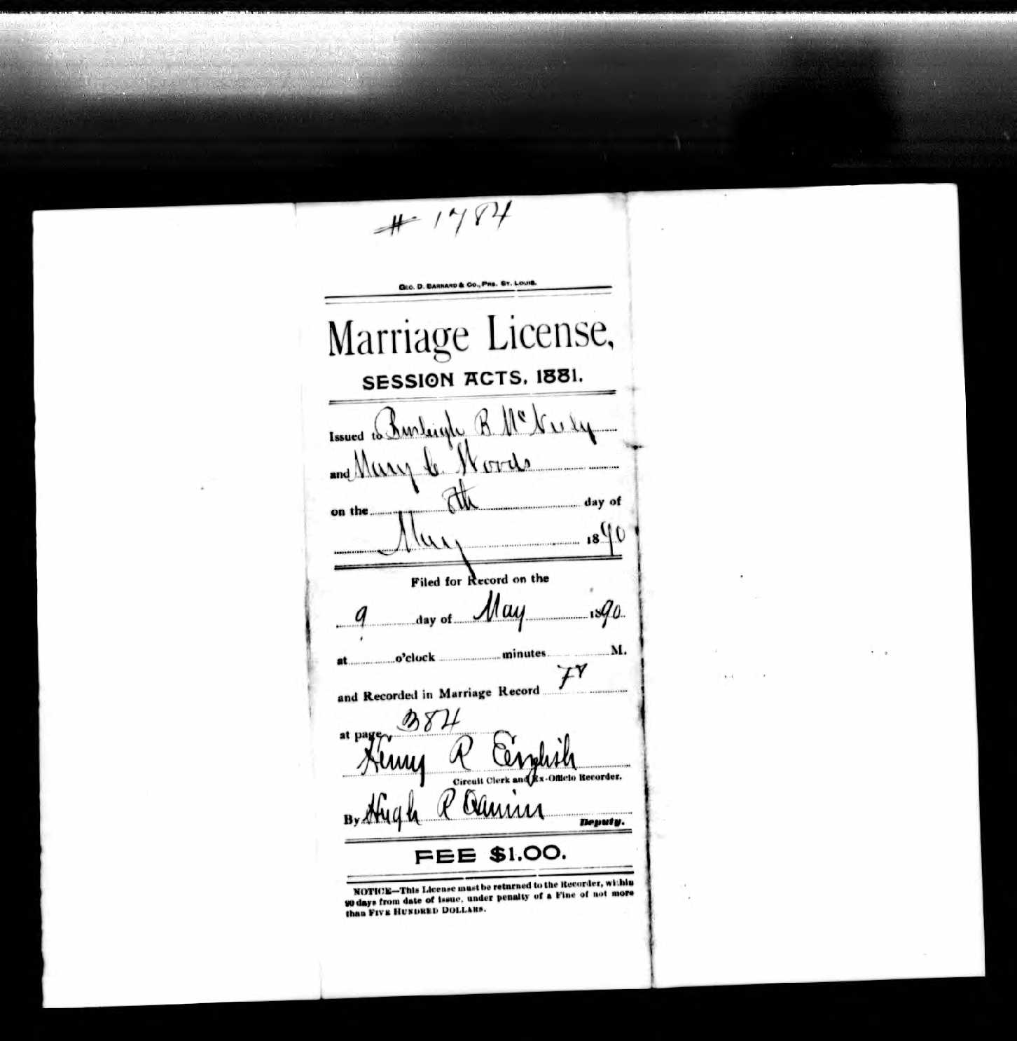 Missouri Marriage Record, Burleigh B. McNeely and Mary C. Woods