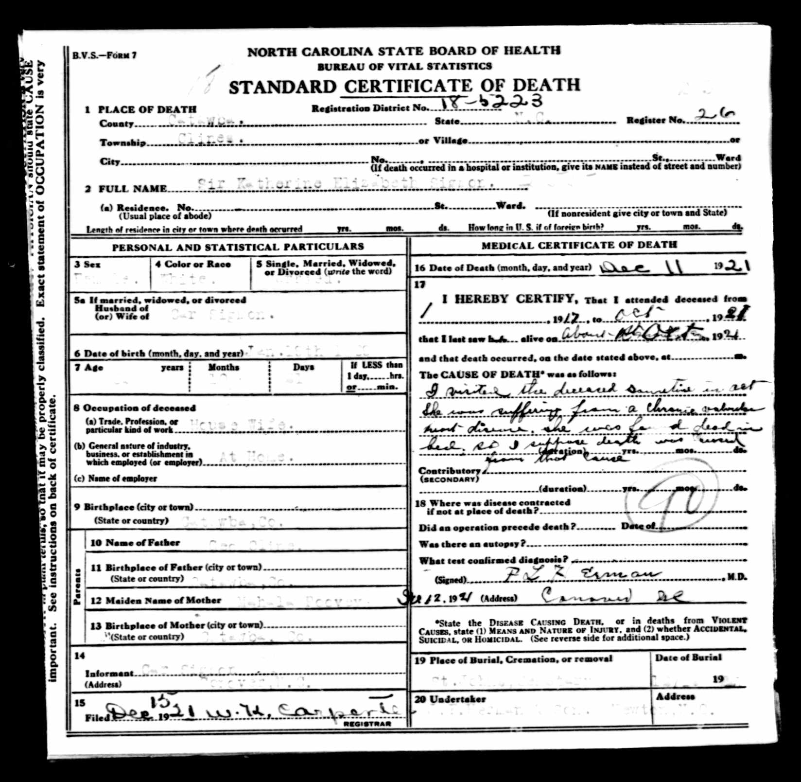 Death Certificate, Sir Katherine Elizabeth Sigmon