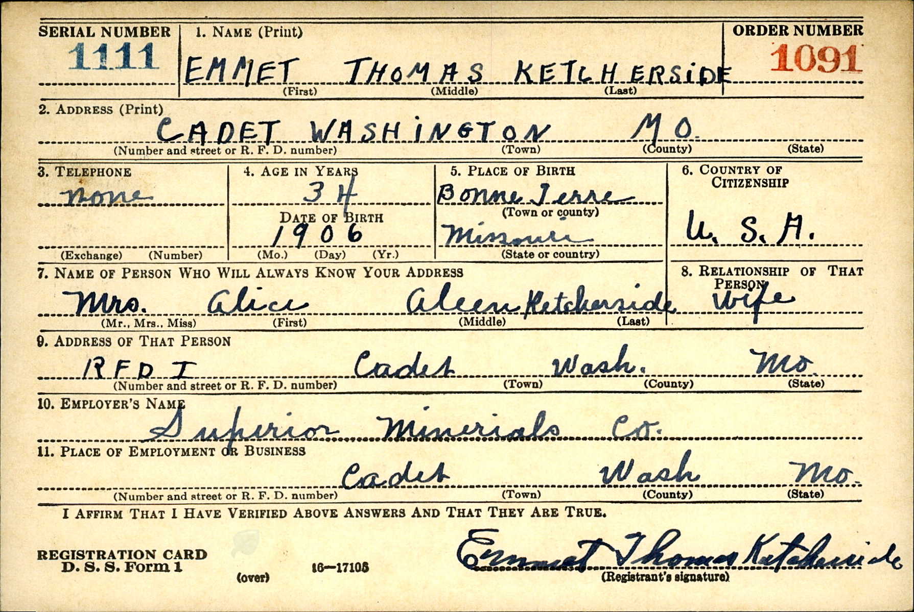 WWII Draft Registration, Emmet Thomas Ketcherside