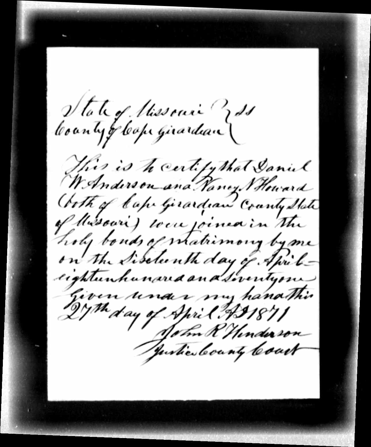 Missouri Marriage Record, Daniel W. Anderson and Nancy N. Howard