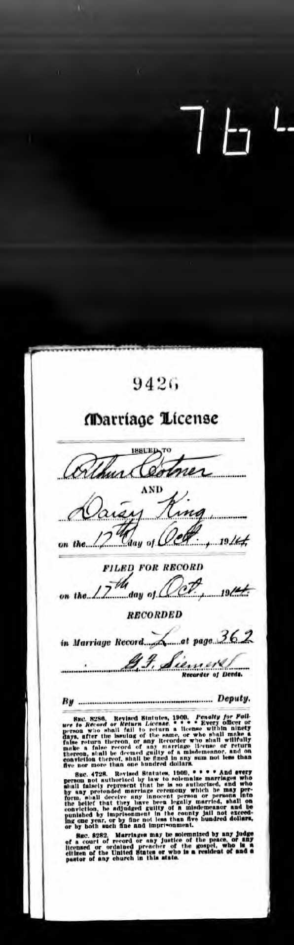 Missouri Marriage Record, Arthur Cotner and Daisy King