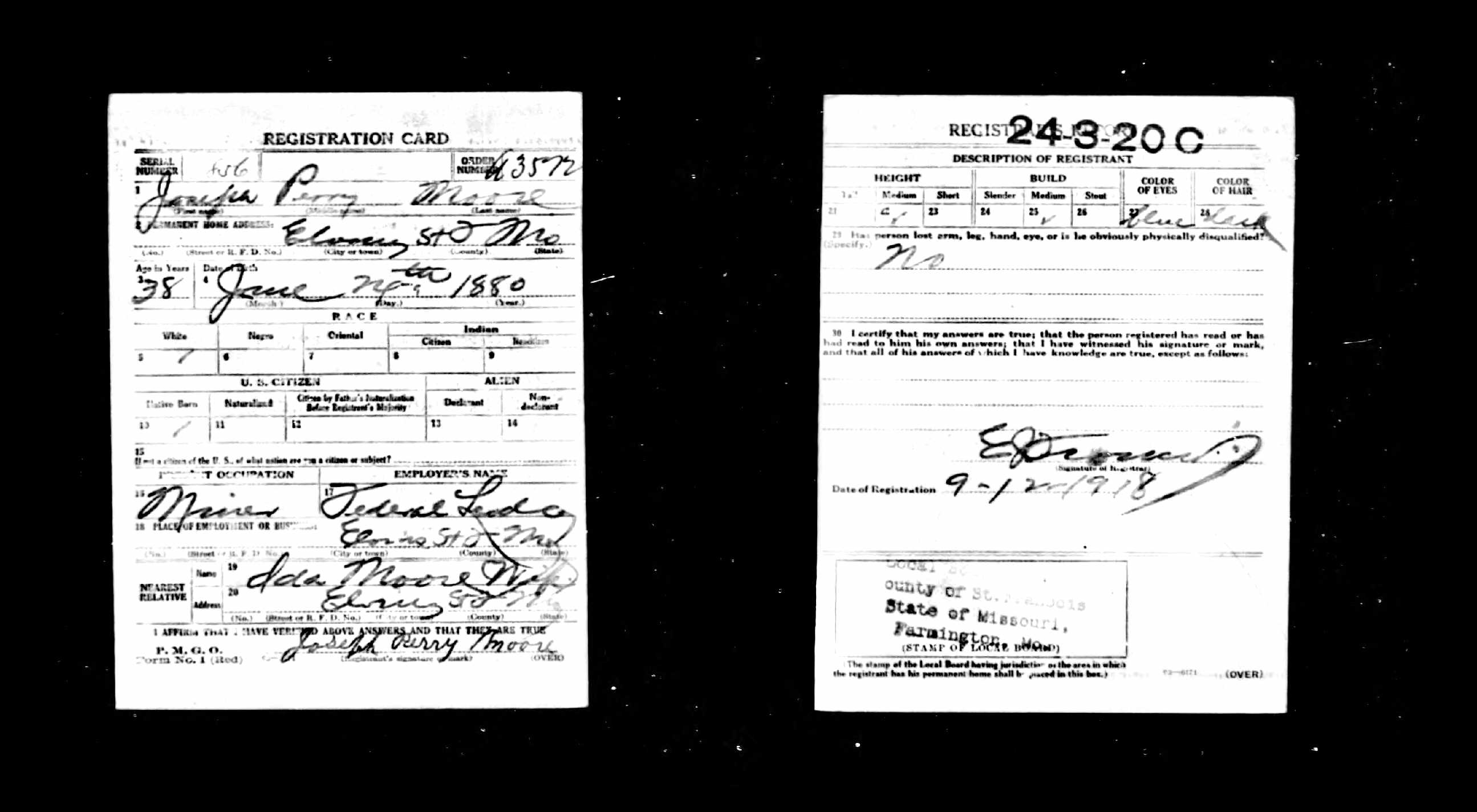 WWI Draft Registration, Joseph Perry Moore