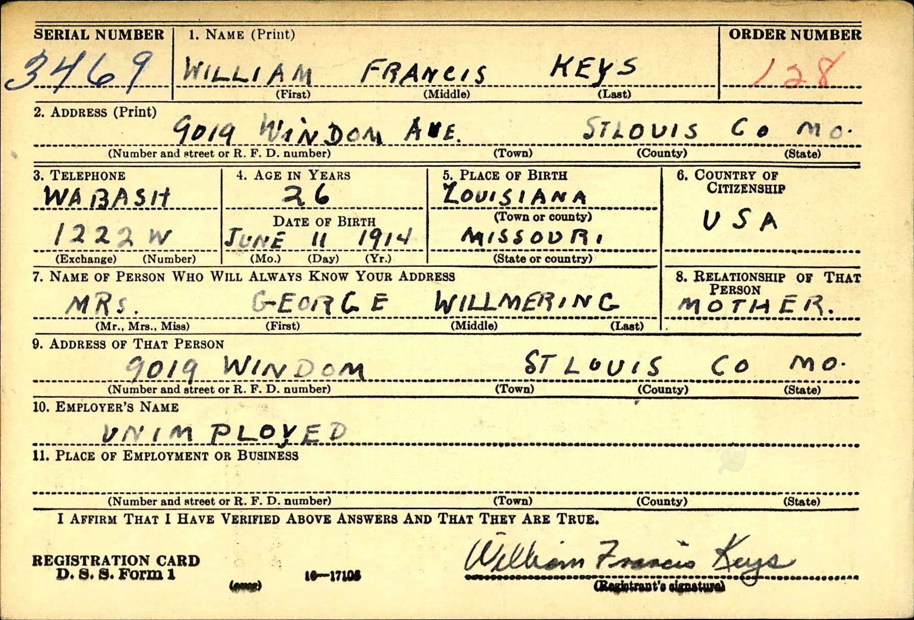 WWII Draft Registration, William Francis Keys