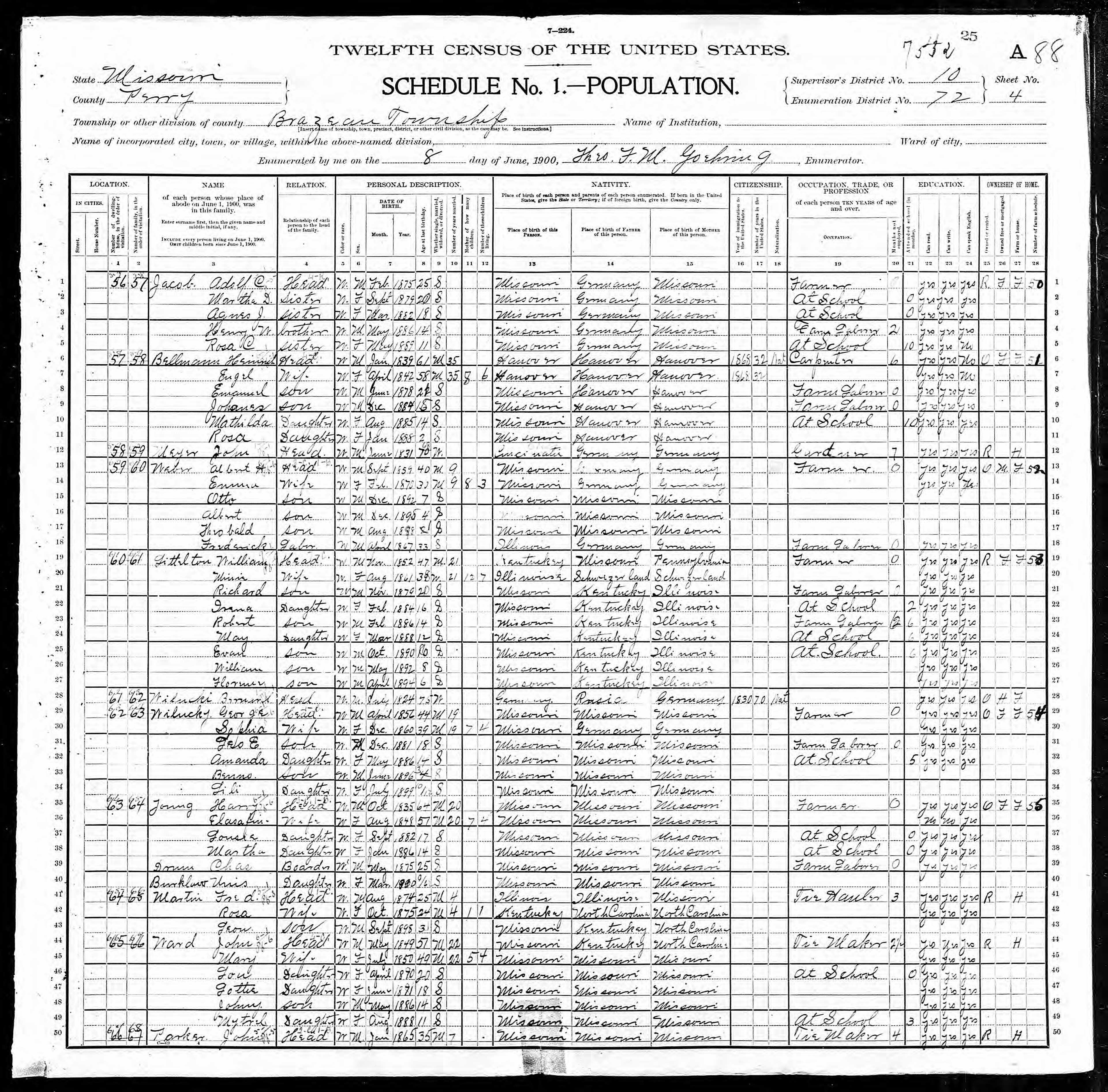 1900 Census, Brazeau township, Perry county, Missouri