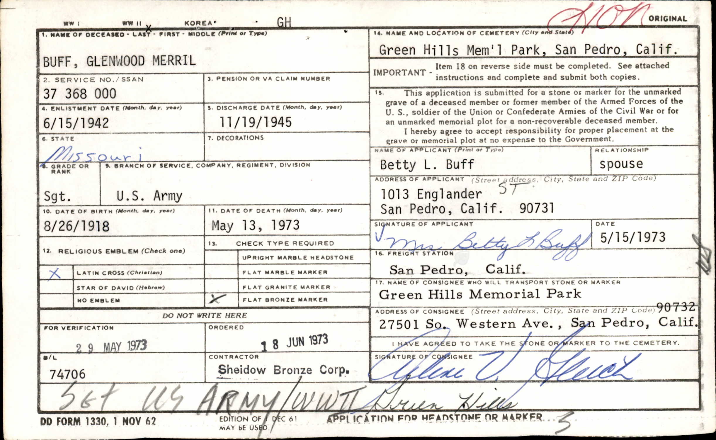 Headstone Application for Military Veteran, Glenwood Merril Buff