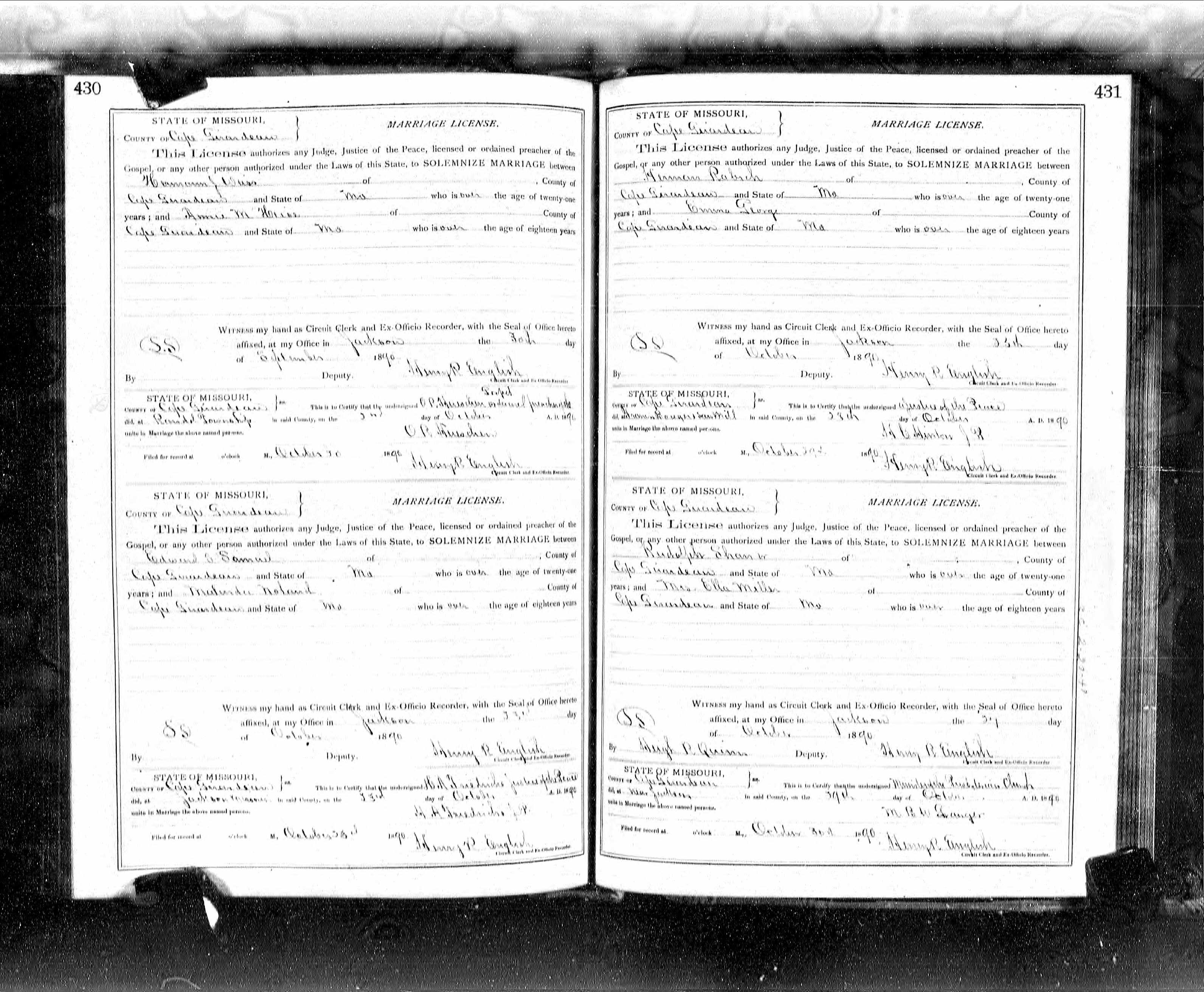 Missouri Marriage Record, Randolph Shaner and Ella Miller
