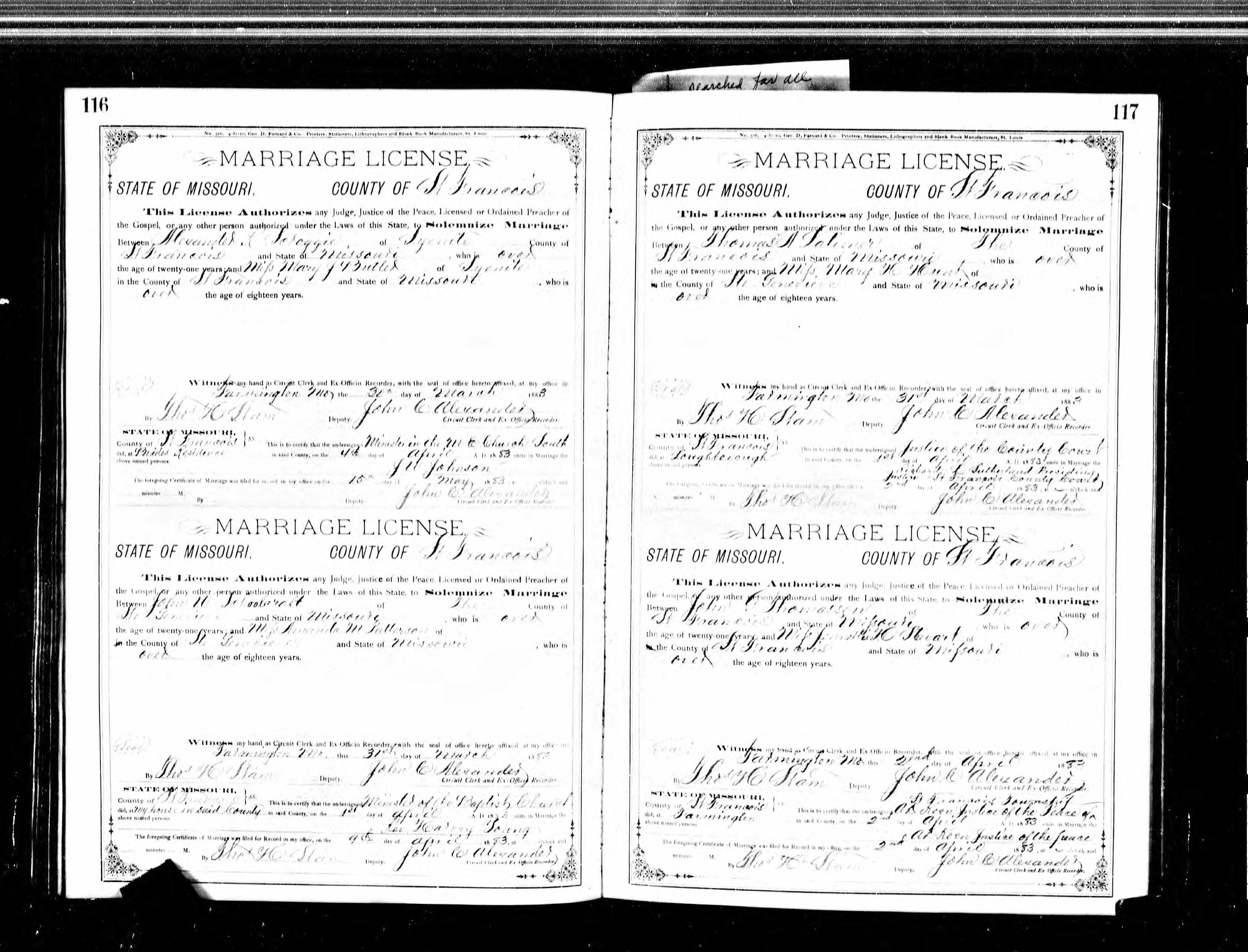 Missouri Marriage Record, Thomas A. Latimer and Mary H. Hunt