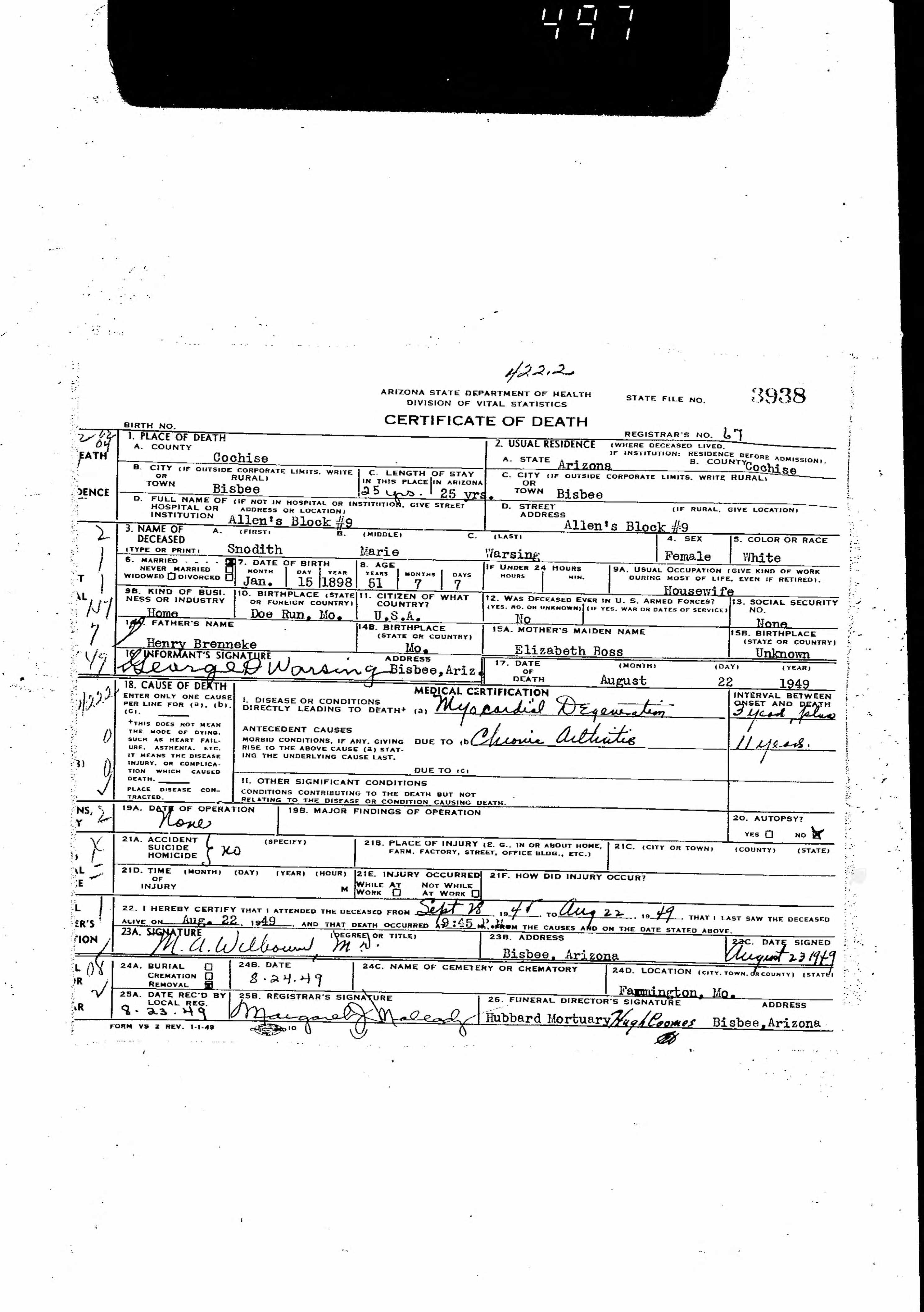 Death Certificate, Snodith Marie Warsing
