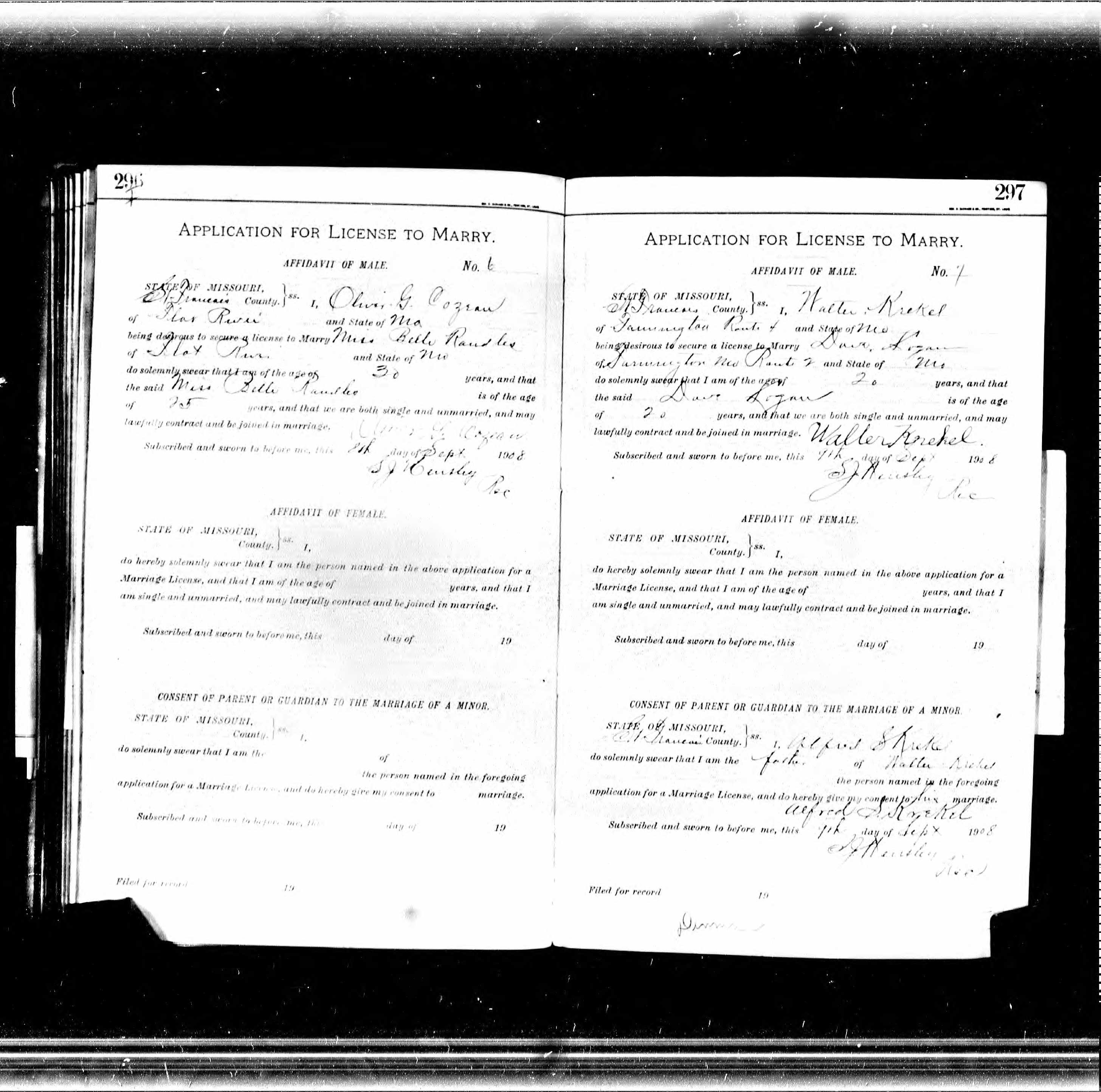 Missouri Marriage Application, Walter Krekel and Dove Logan