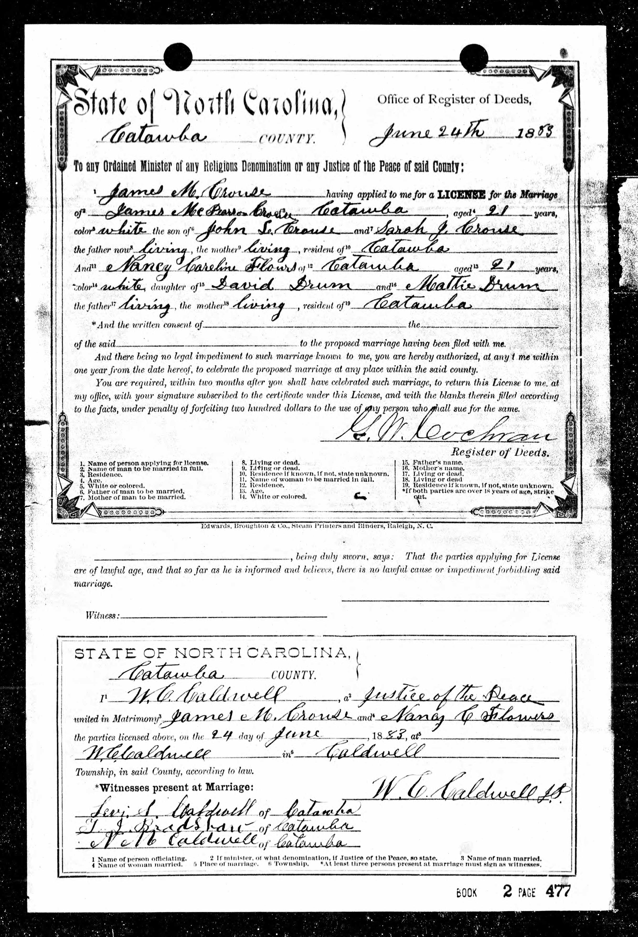 North Carolina Marriage Record, James M. Crouse and Nancy Caroline Flours