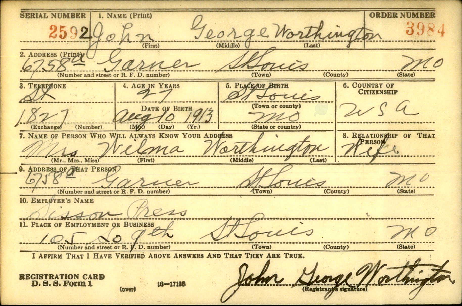 WWII Draft Registration, John George Worthington