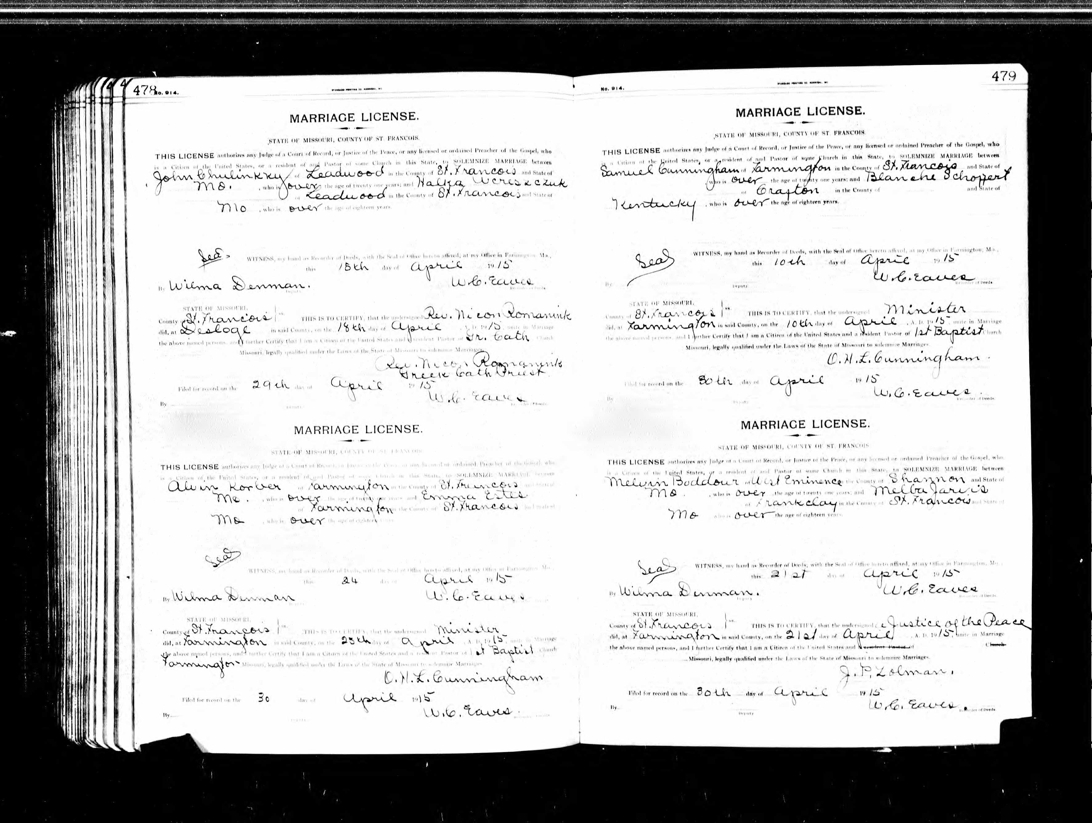 Missouri Marriage Record, Alvin Korber and Emma Estes, Samuel Cunningham and Blanche Schoppert