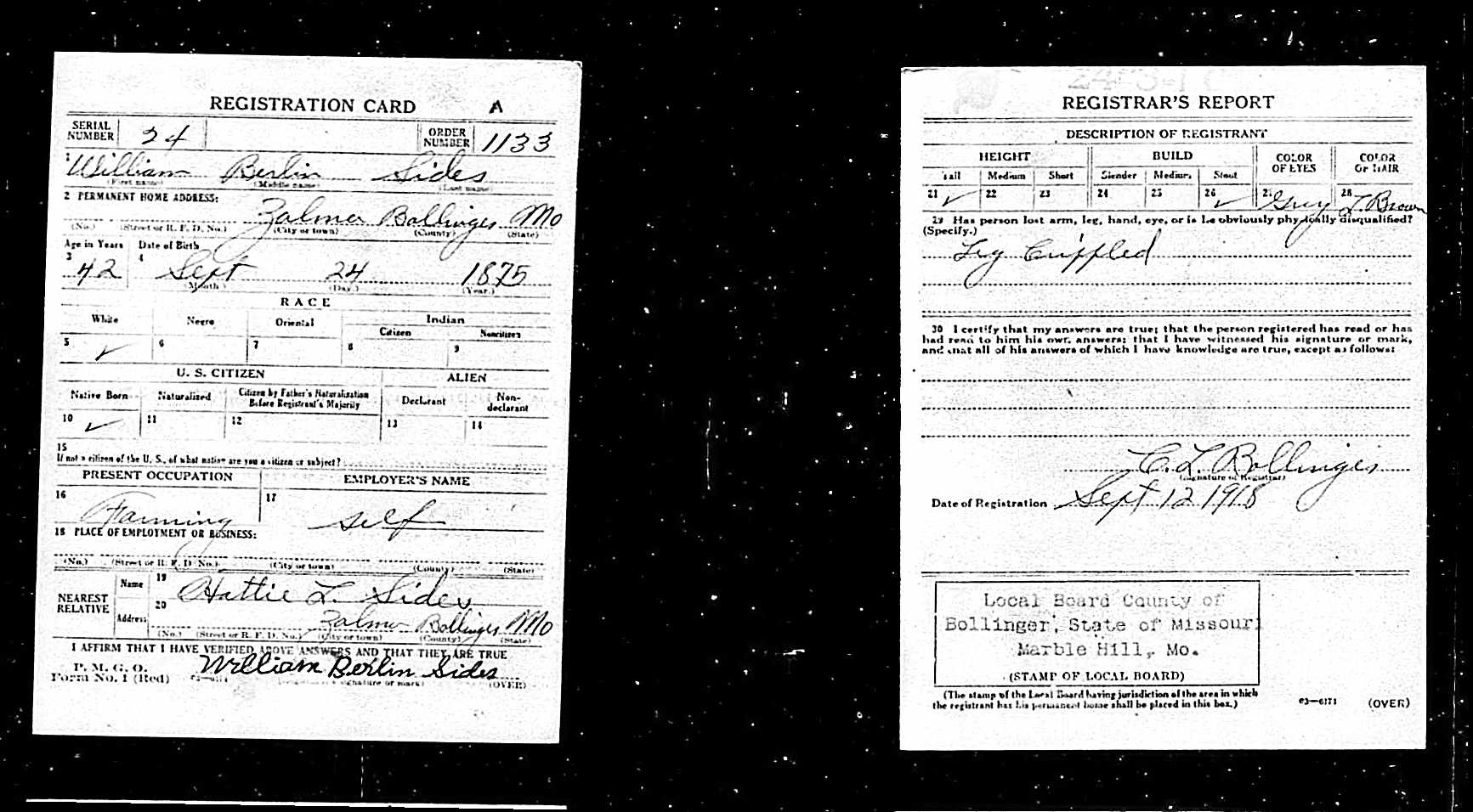 WWI Draft Registration, William Berlin Sides