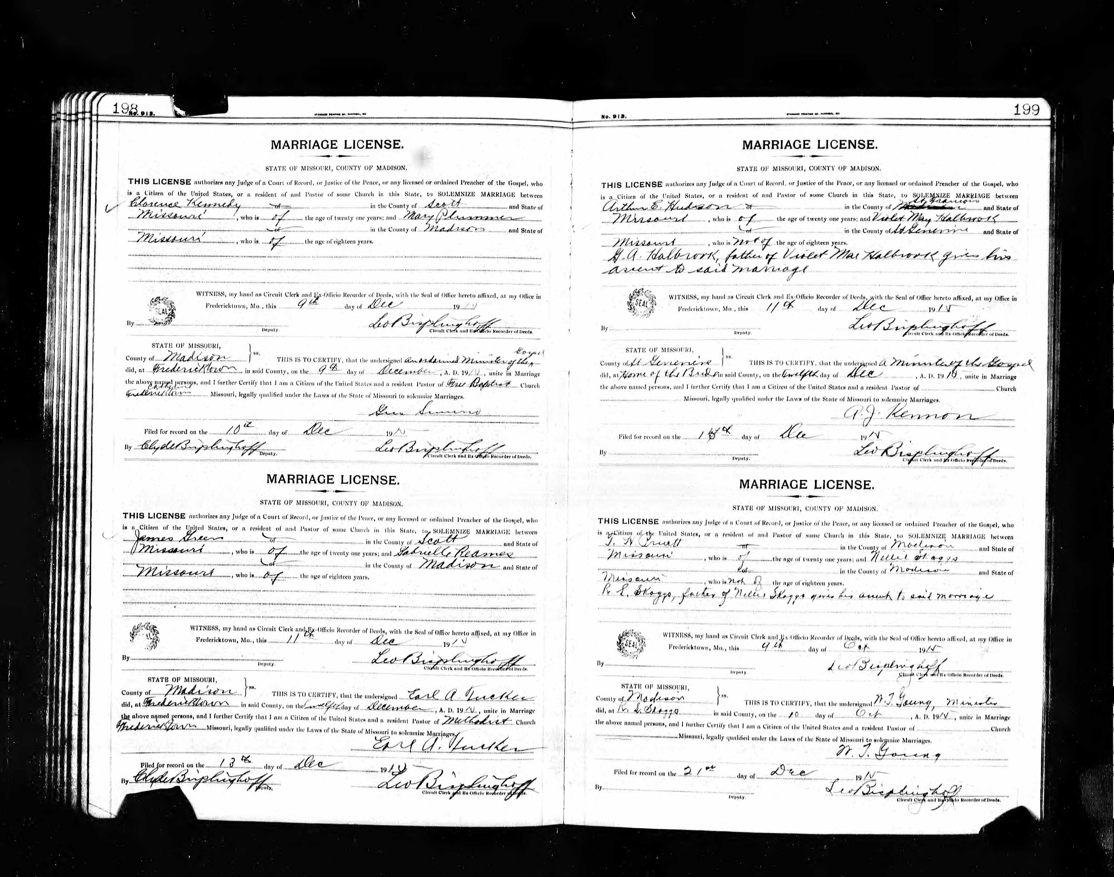 Missouri Marriage Record, Arthur E. Hutson and Violet May Halbrook