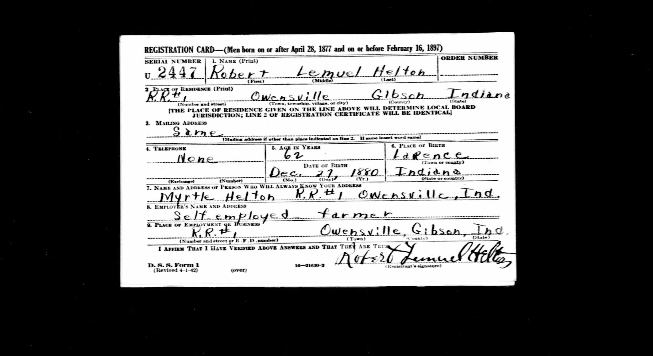 WWII Draft Registration, Robert Lemuel Helton