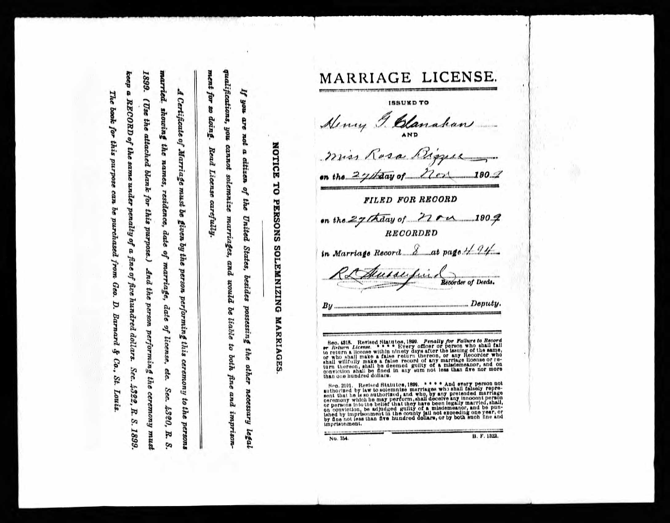 Missouri Marriage Record, Henry G. Clanahan and Rosa Bizzell