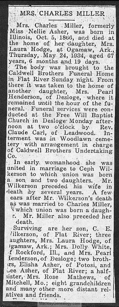 Obituary, Mrs. Charles Miller