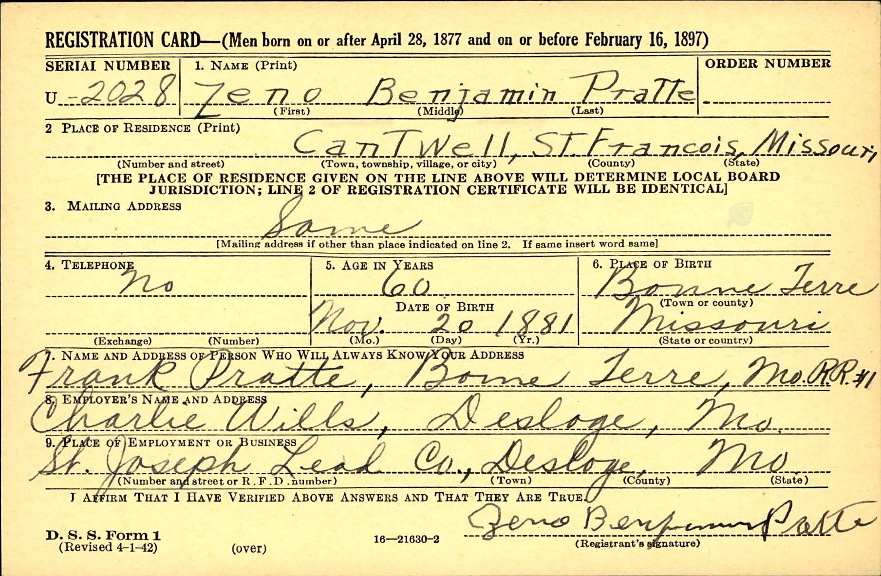 WWII Draft Registration, Zeno Benjamin Pratte