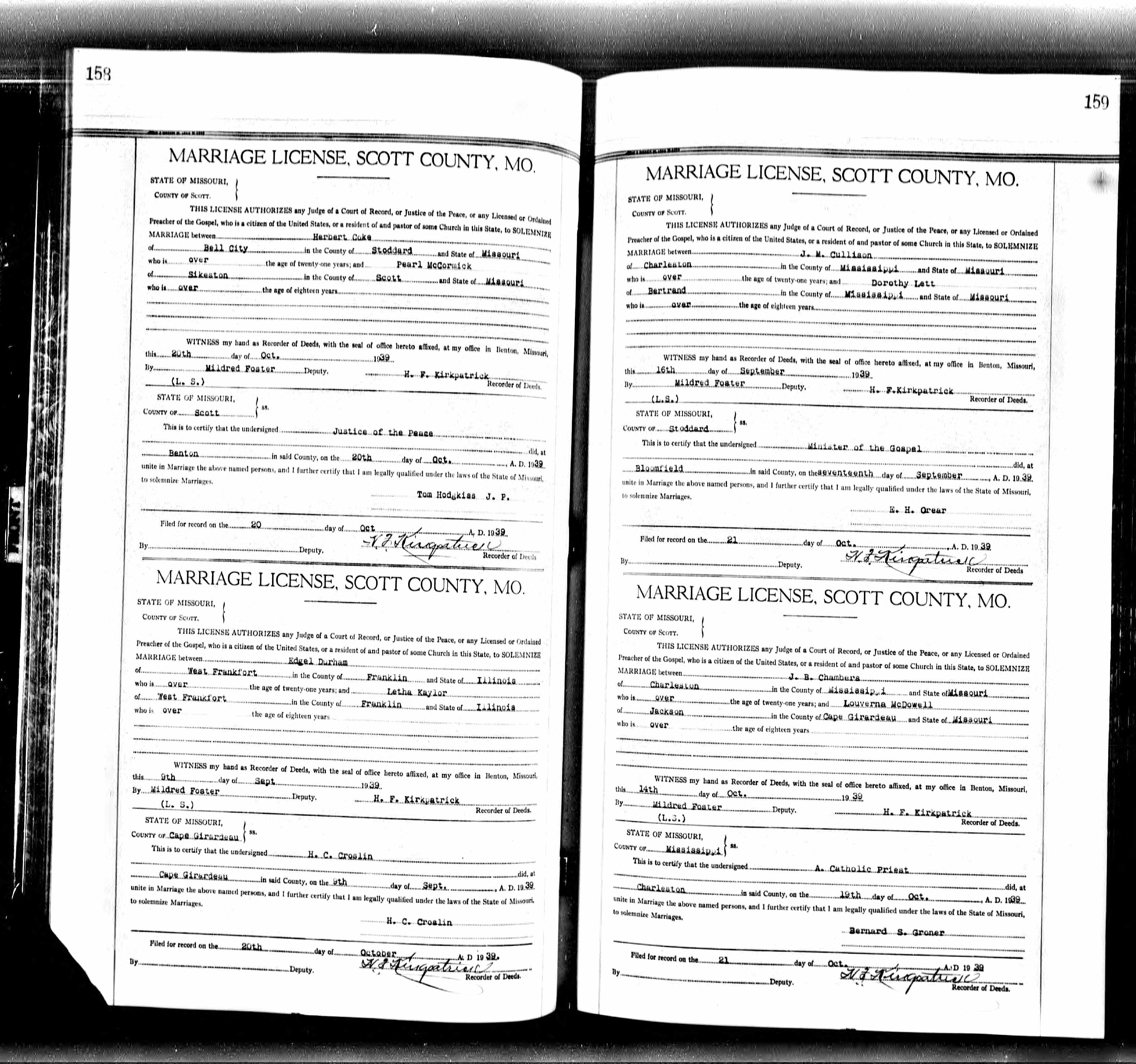 Missouri Marriage Record, J. B. Chambers and Louverna McDowell