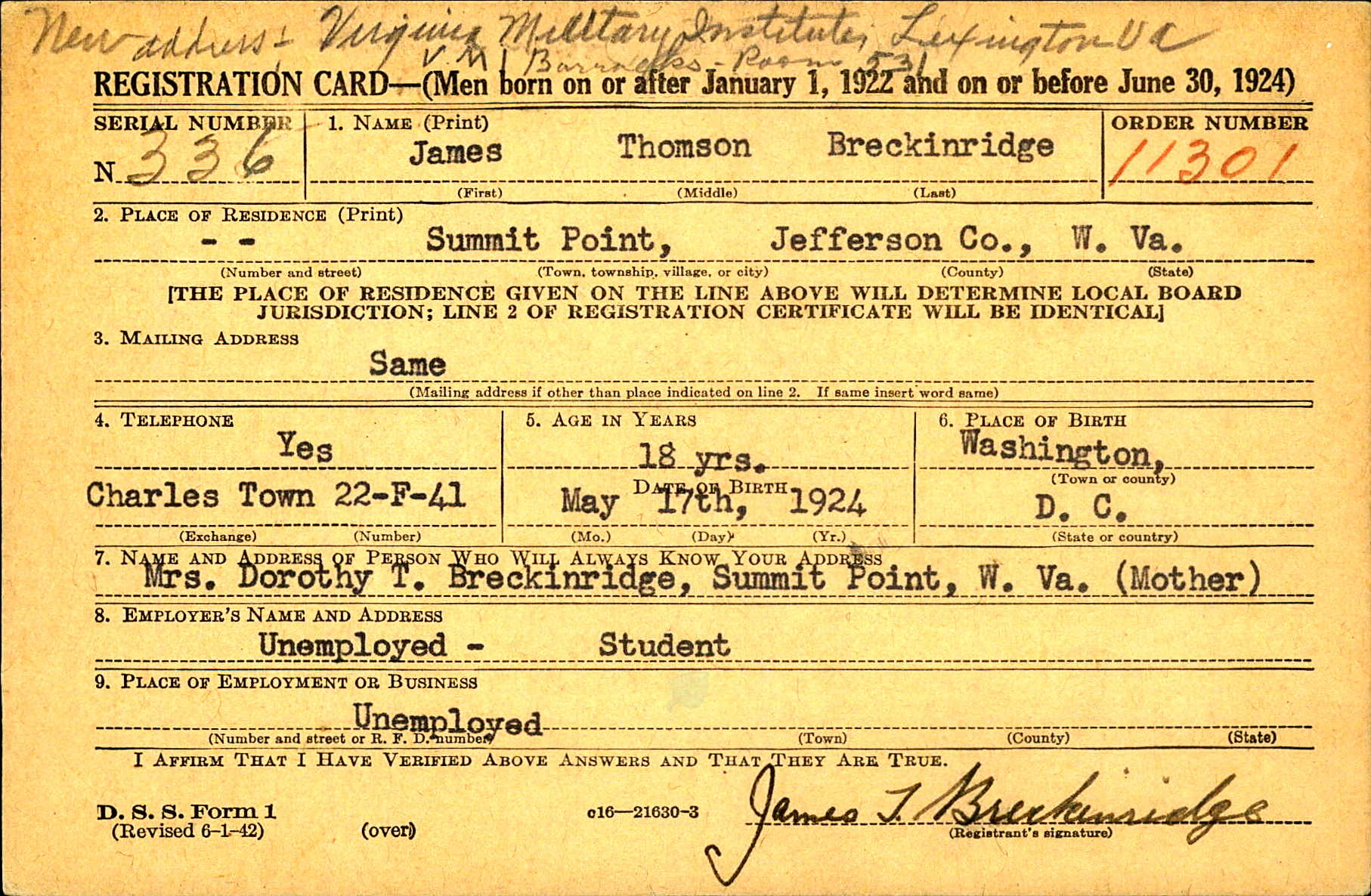 WWII Draft Registration, James Thomson Breckinridge