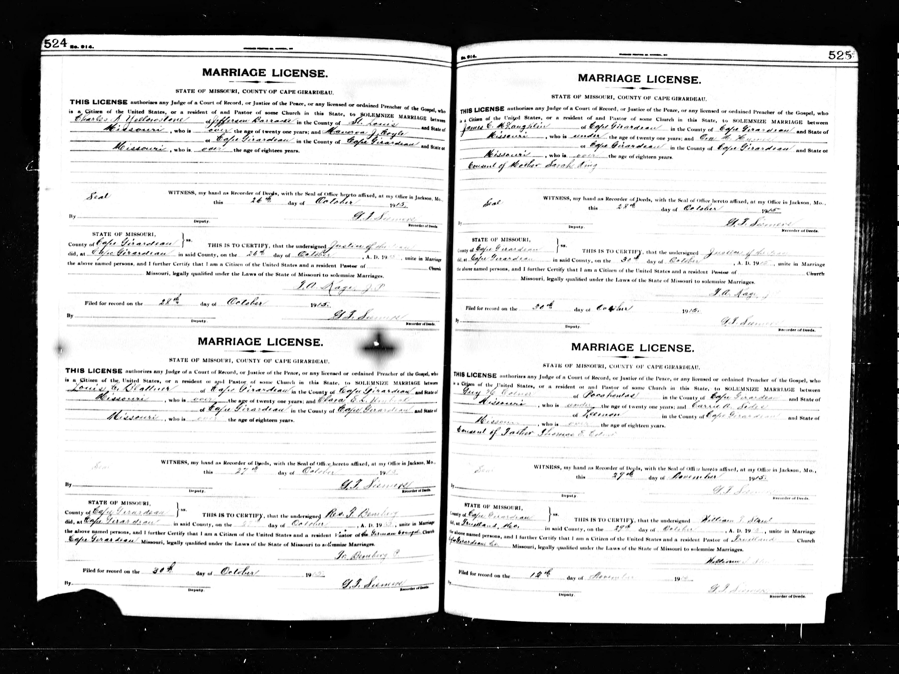 Missouri Marriage Records, James C. McLaughlin and Ora M. Humes, Guy H. Cotner and Carrie A. Sides