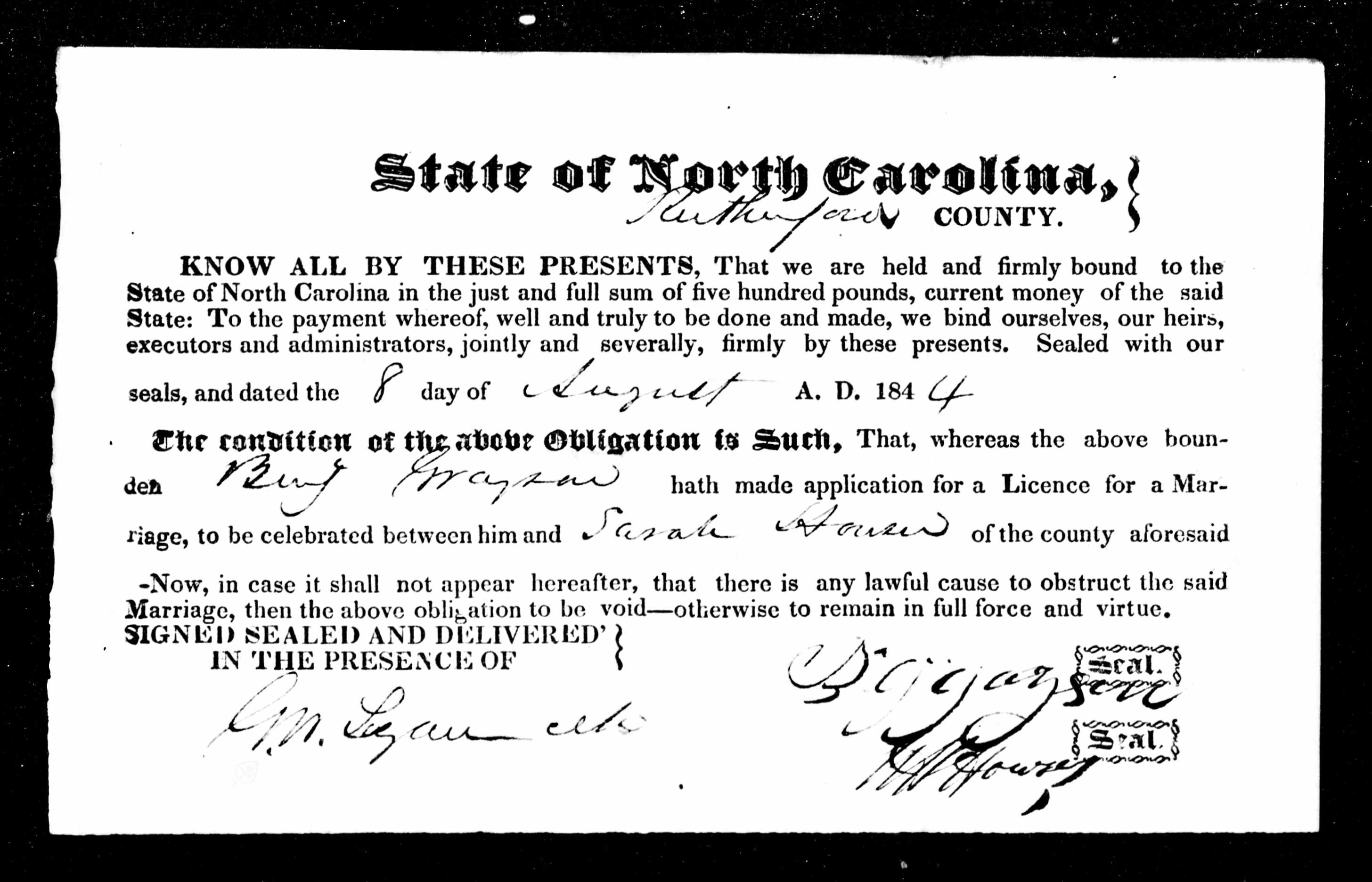 North Carolina Marriage Record, Benjamin Grayson and Sarah Houser