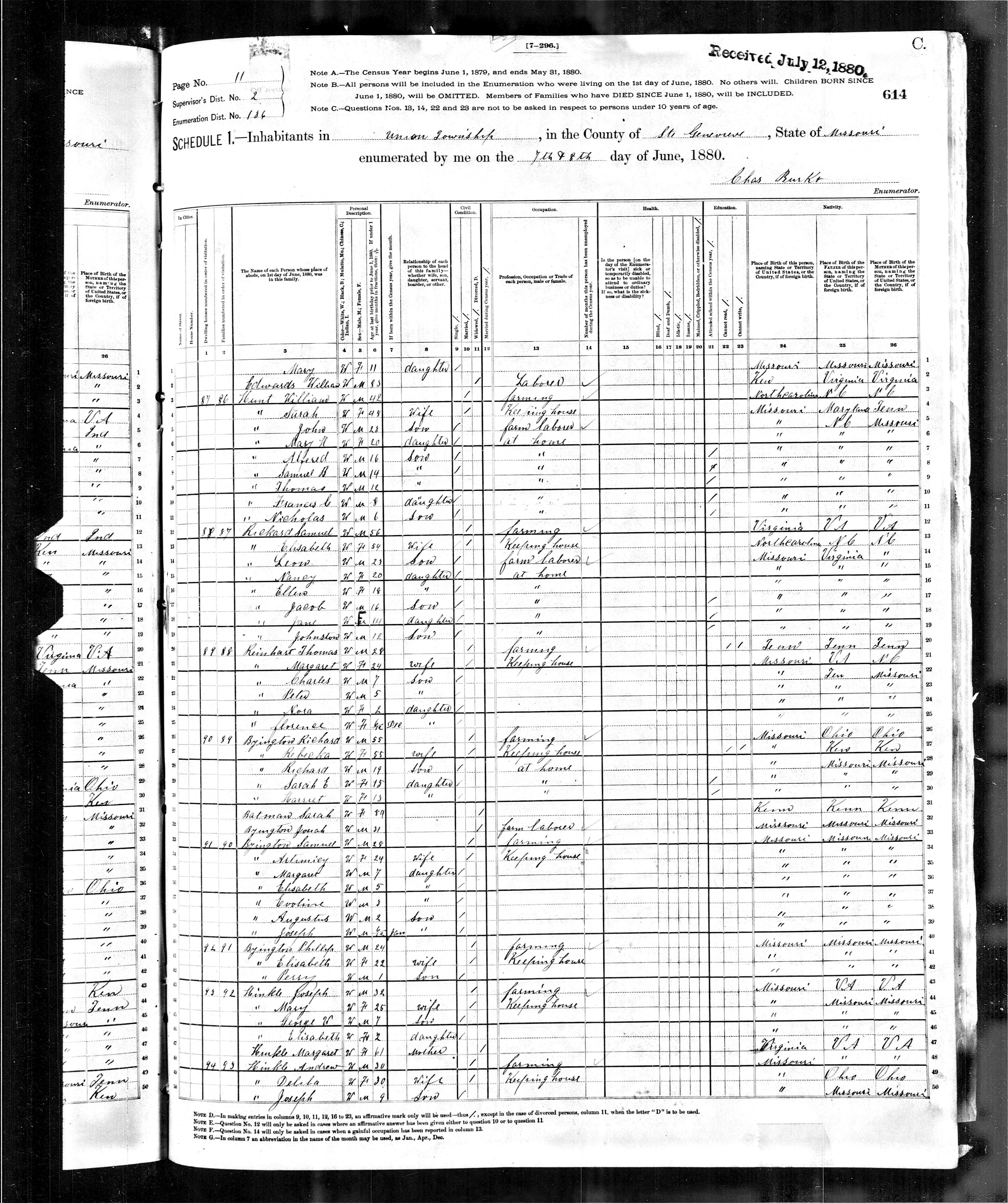 1880 Census, Union township, Ste. Genevieve county, Missouri