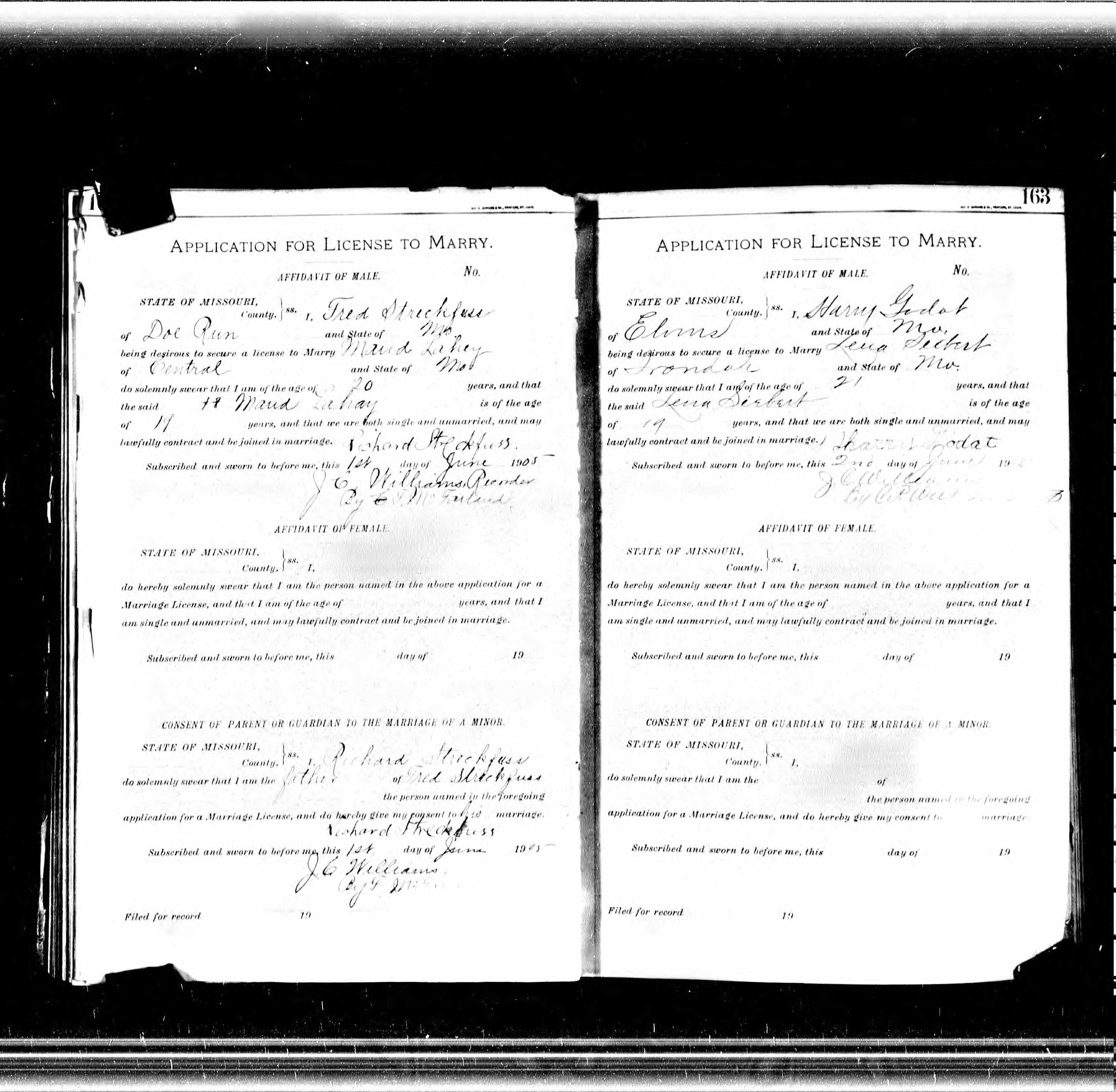 Missouri Marriage Application, Fred Streckfuss and Maud Lahey, Harry Godat and Lena Seabert
