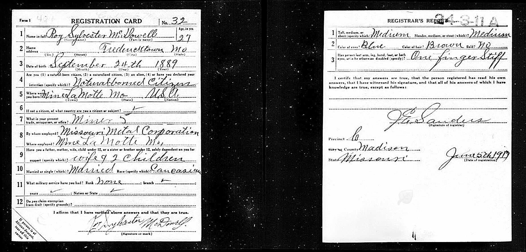 WWI Draft Registration, Roy Sylvester McDowell