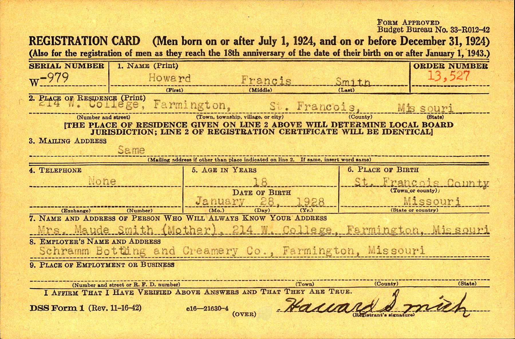 WWII Draft Registration, Howard Francis Smith