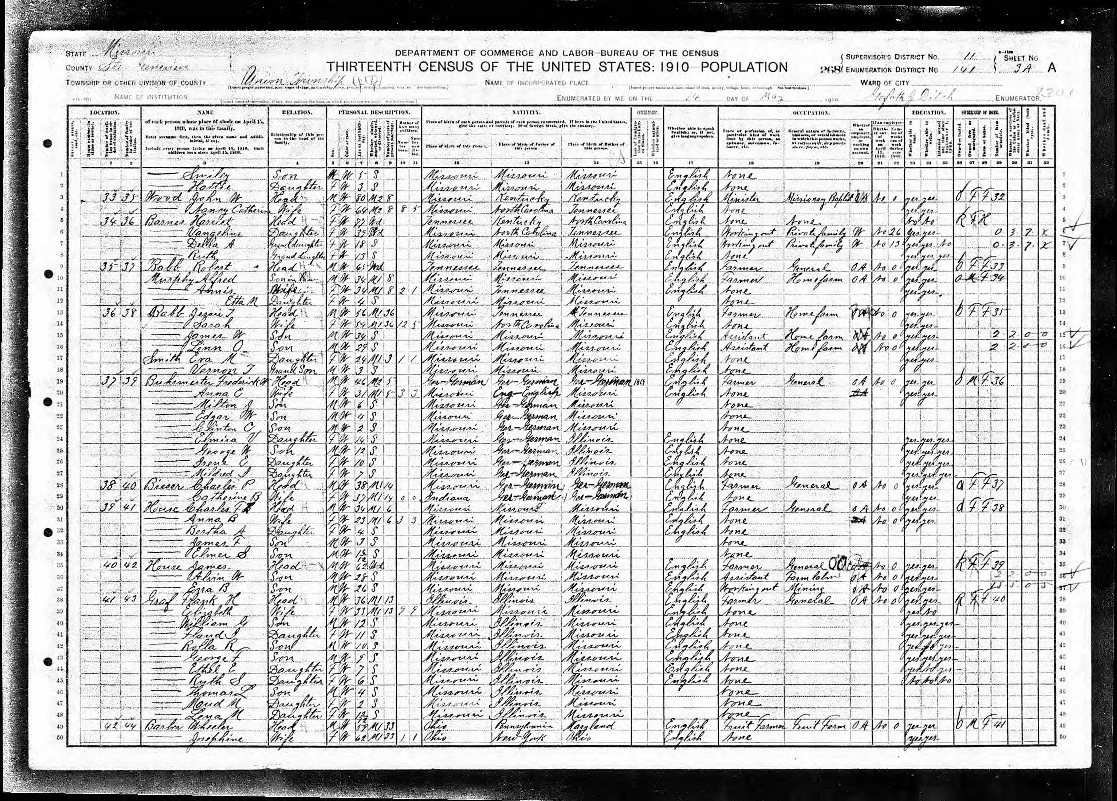 1910 Census, Union township, Ste. Genevieve county, Missouri