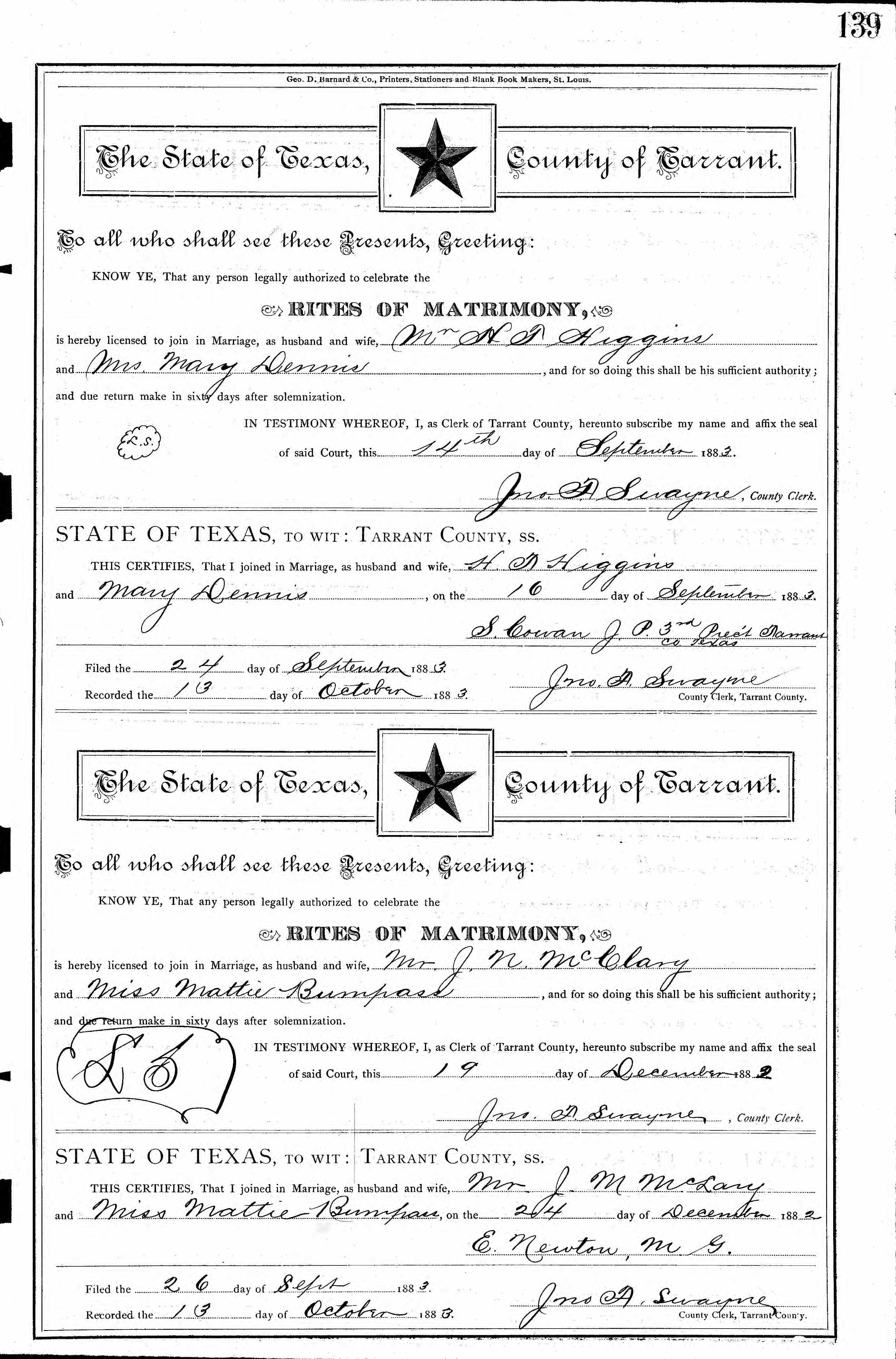 Texas Marriage Record, J. N. McClary and Mattie Bumpass