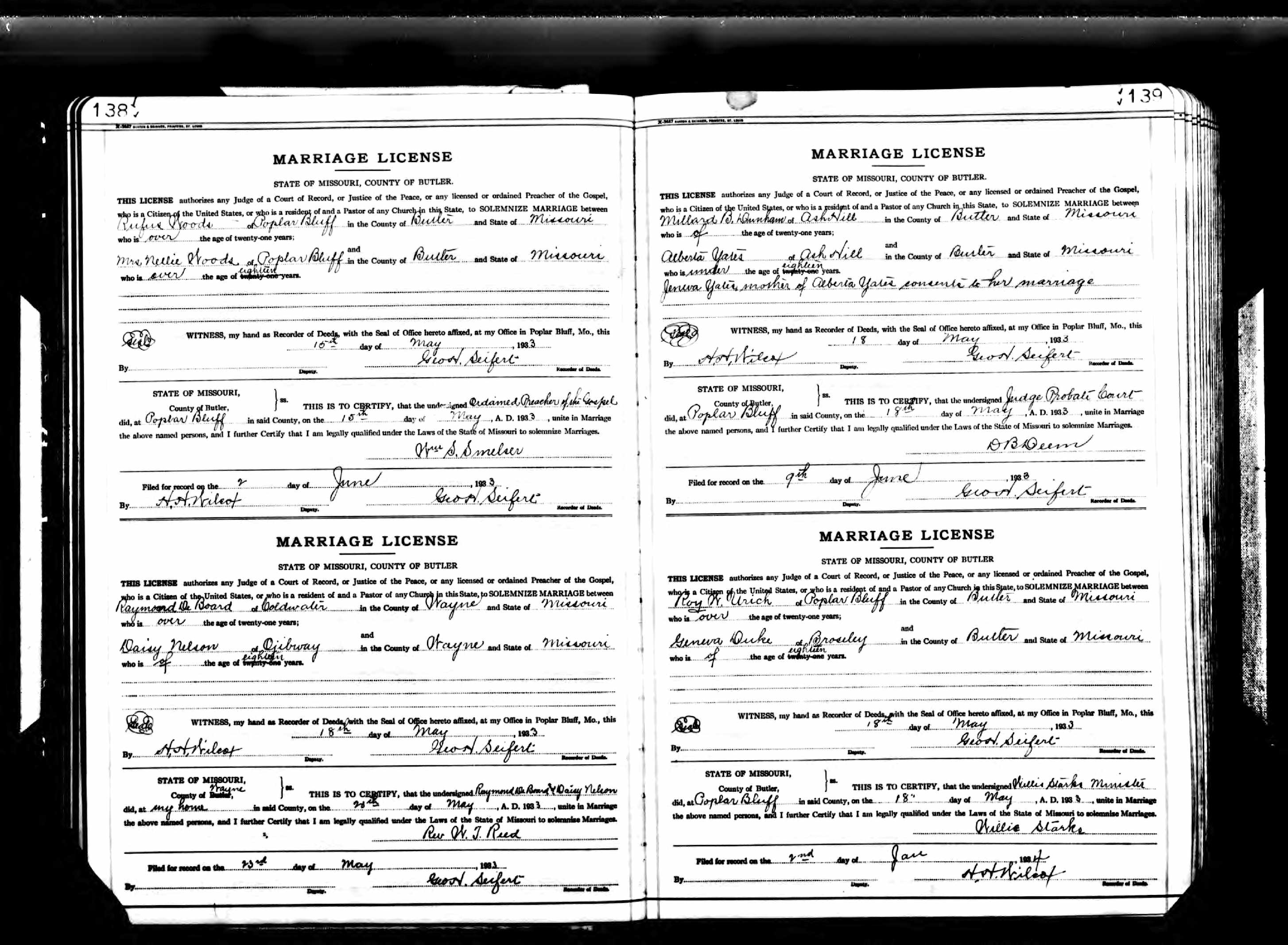 Missouri Marriage Record, Raymond DeBoard and Daisy Nelson
