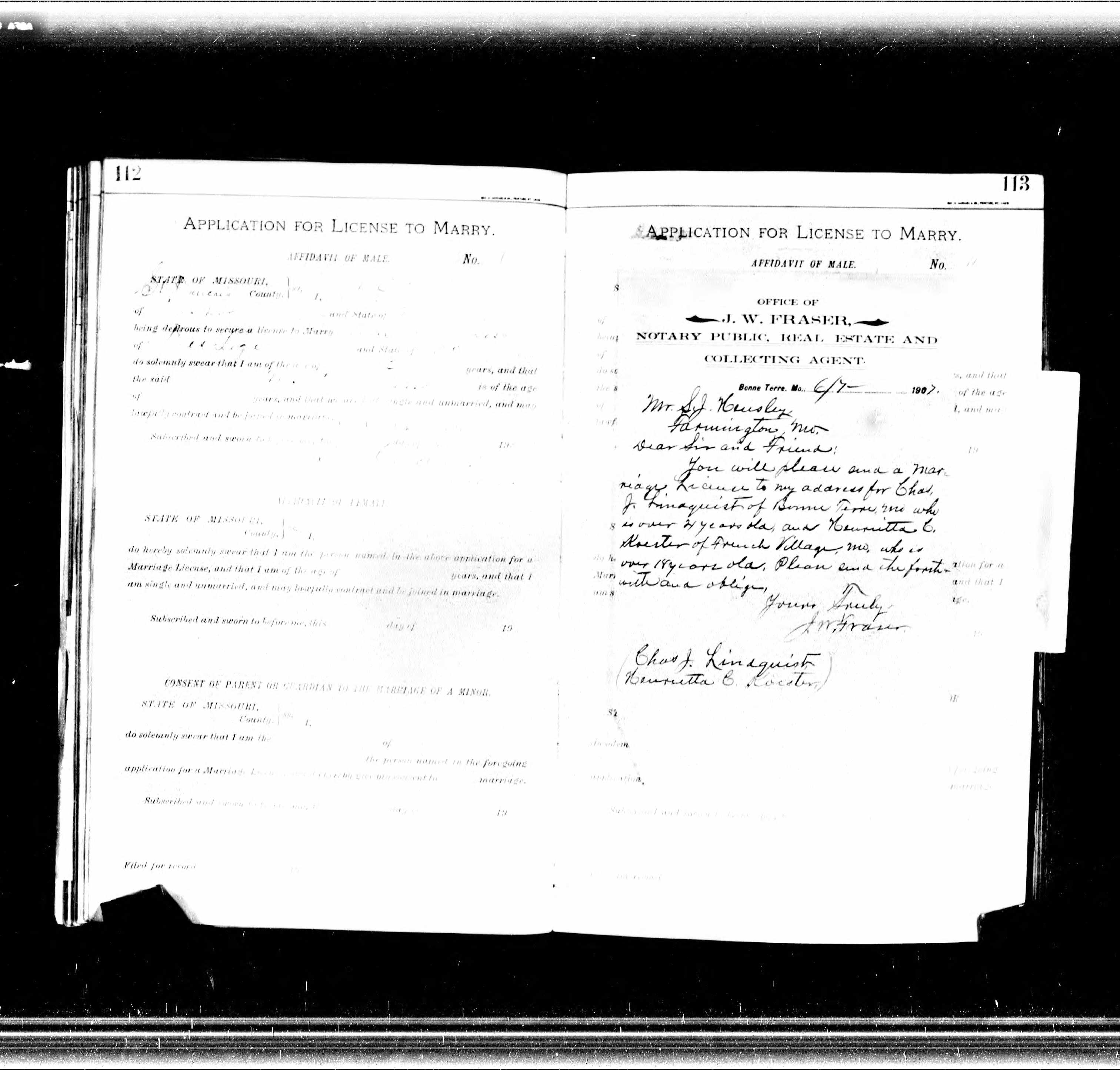 Missouri Marriage Application, Charles J. Lindquist and Henrietta C. Koester