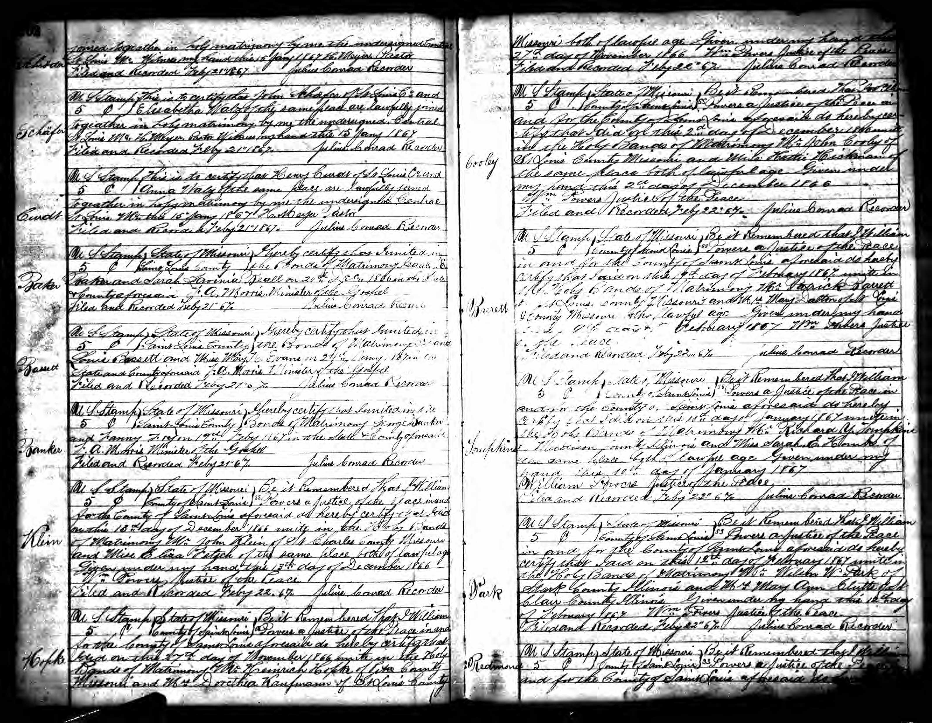 Missouri Marriage Record, Richard Y. Tompkins and Sarah E. Hombs