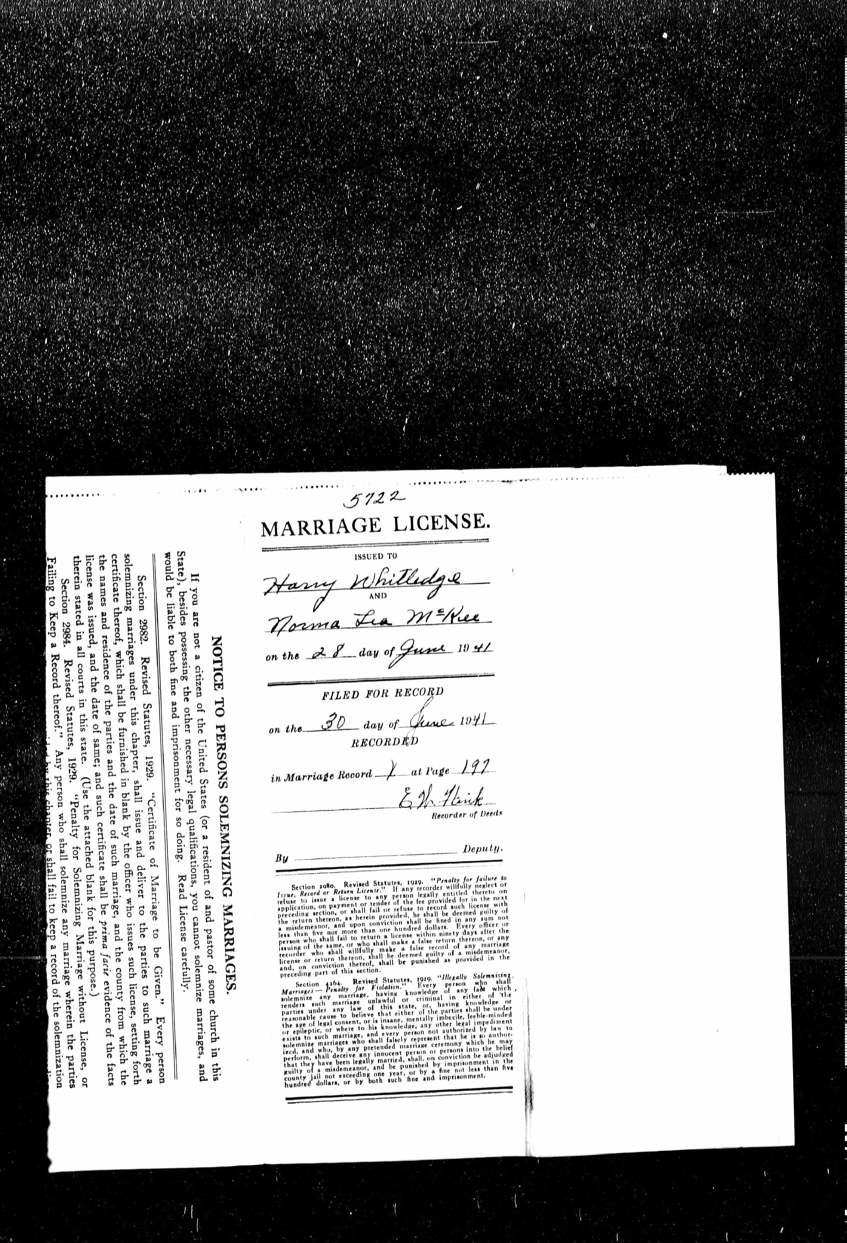 Missouri Marriage Record, Harry Whitledge and Norma Lee McKee
