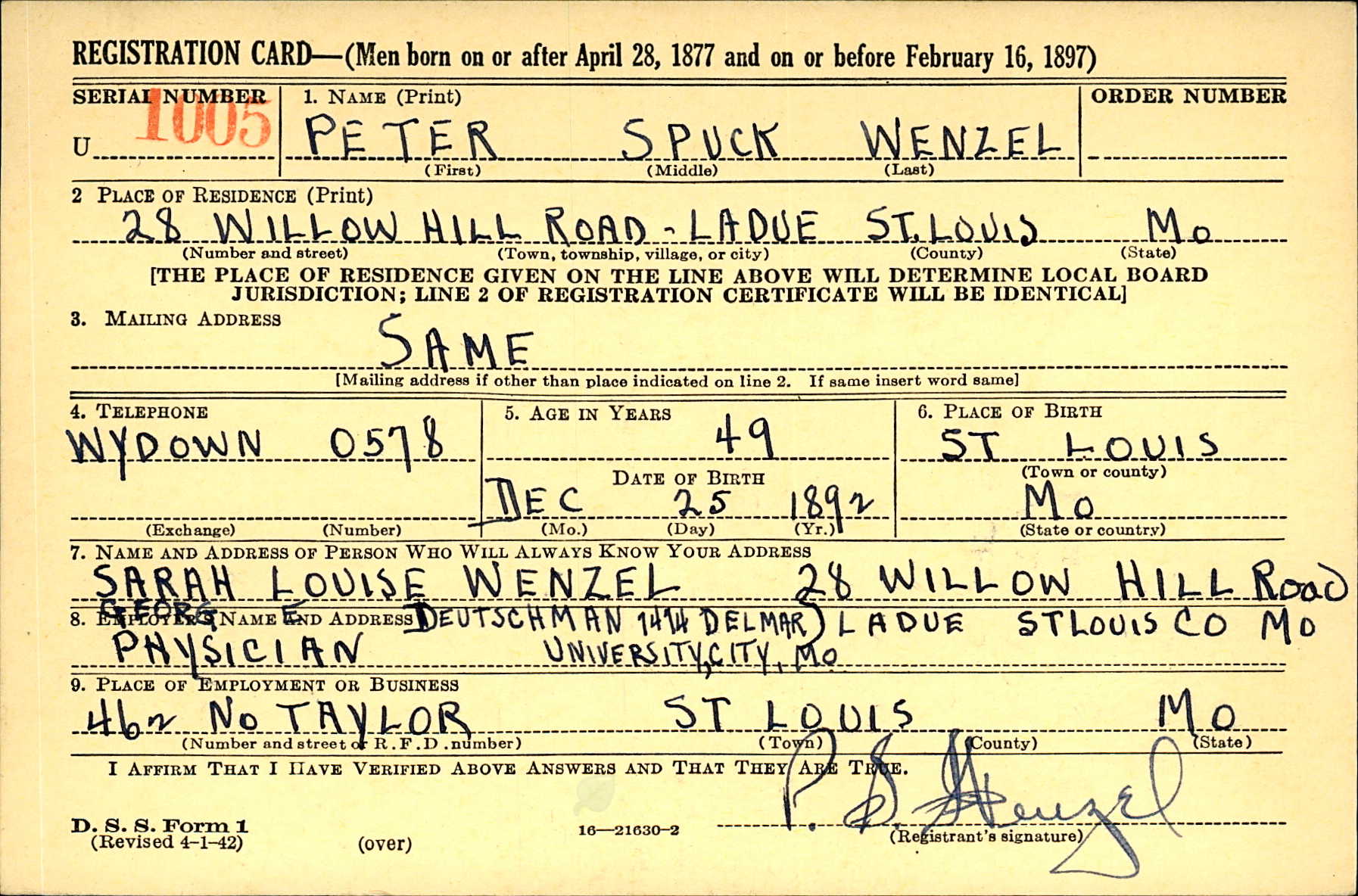 WWII Draft Registration, Peter Spuck Wenzel