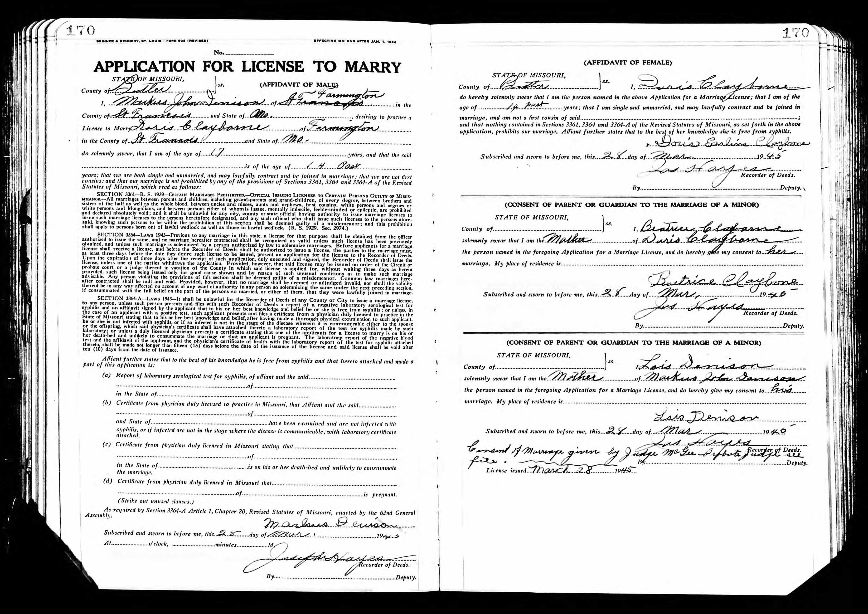 Missouri Marriage Record, Markus John Denison and Doris Clayborne