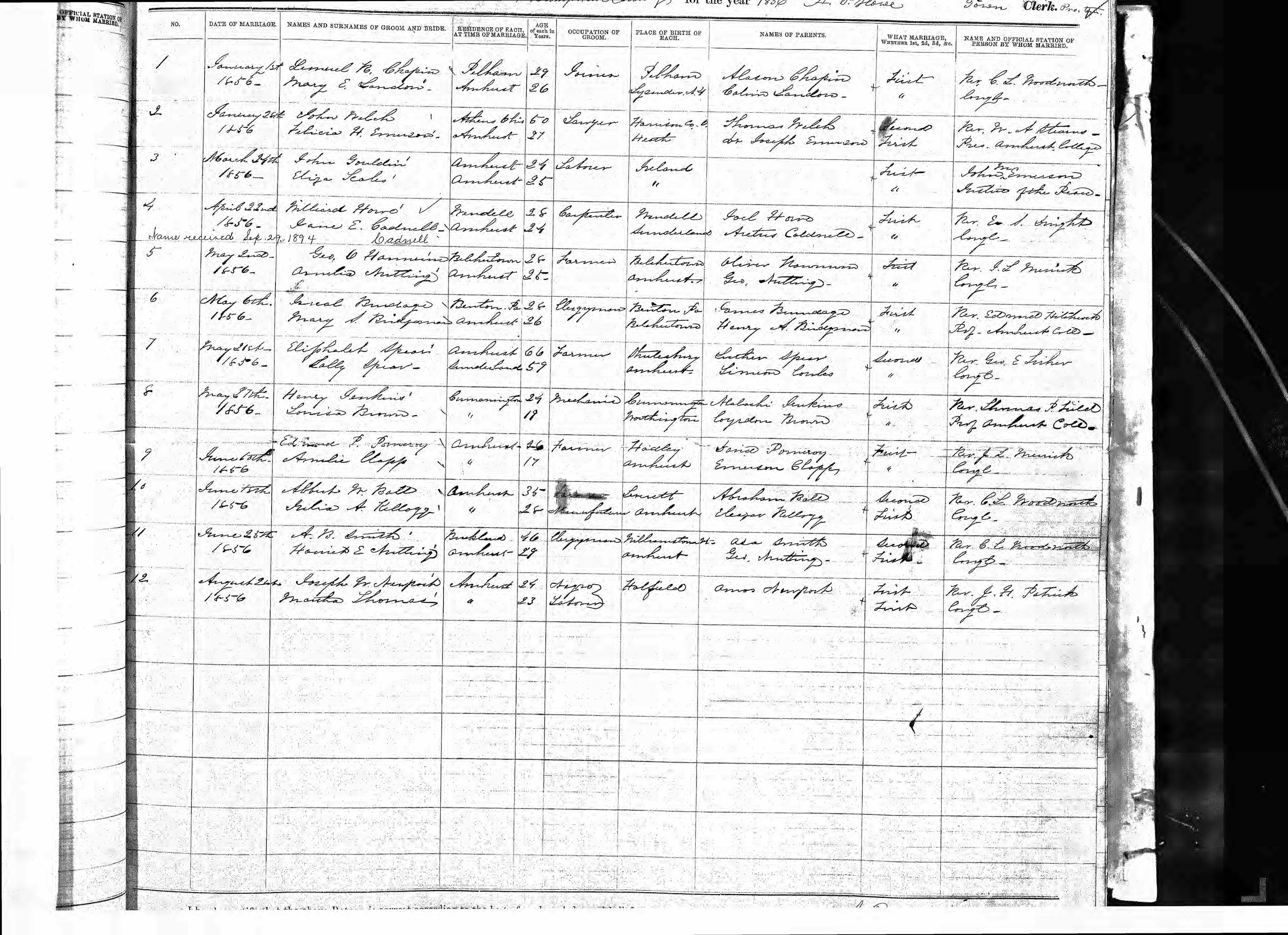 Massachusetts Marriage Record, Israel Brundage and Mary S. Bridgman