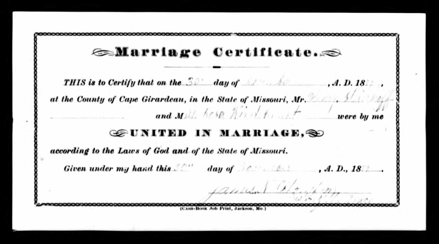 Missouri Marriage Record, Henry Steinhoff and Rosa Windeknecht